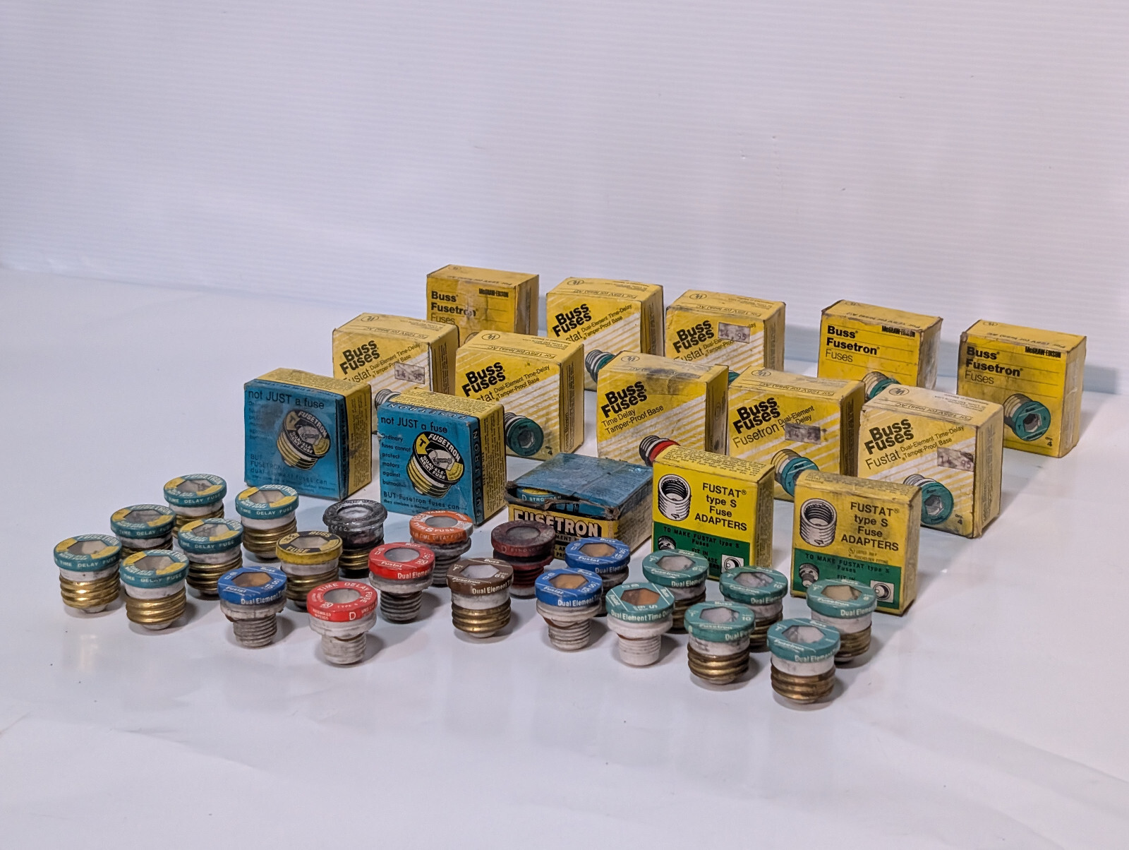 Lot of 42: Assorted Buss Fuses, Fusetron, Fustat, Type S Adapters, Dual Element