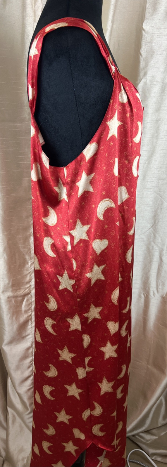 как выглядит VTG Barbizon Red Satin Sleeveles Nightgown W/Button Details Moons Stars Large фото