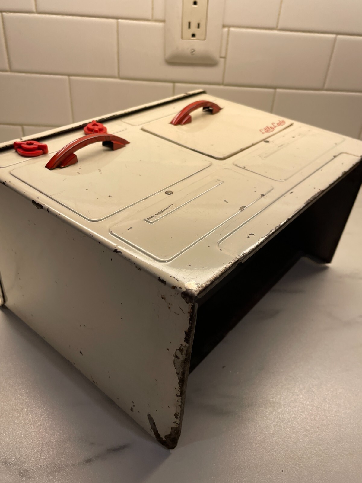 как выглядит VTG Metal Tin Empire 226 Little Lady Cooking Stove Toy white red 1960s no cord фото
