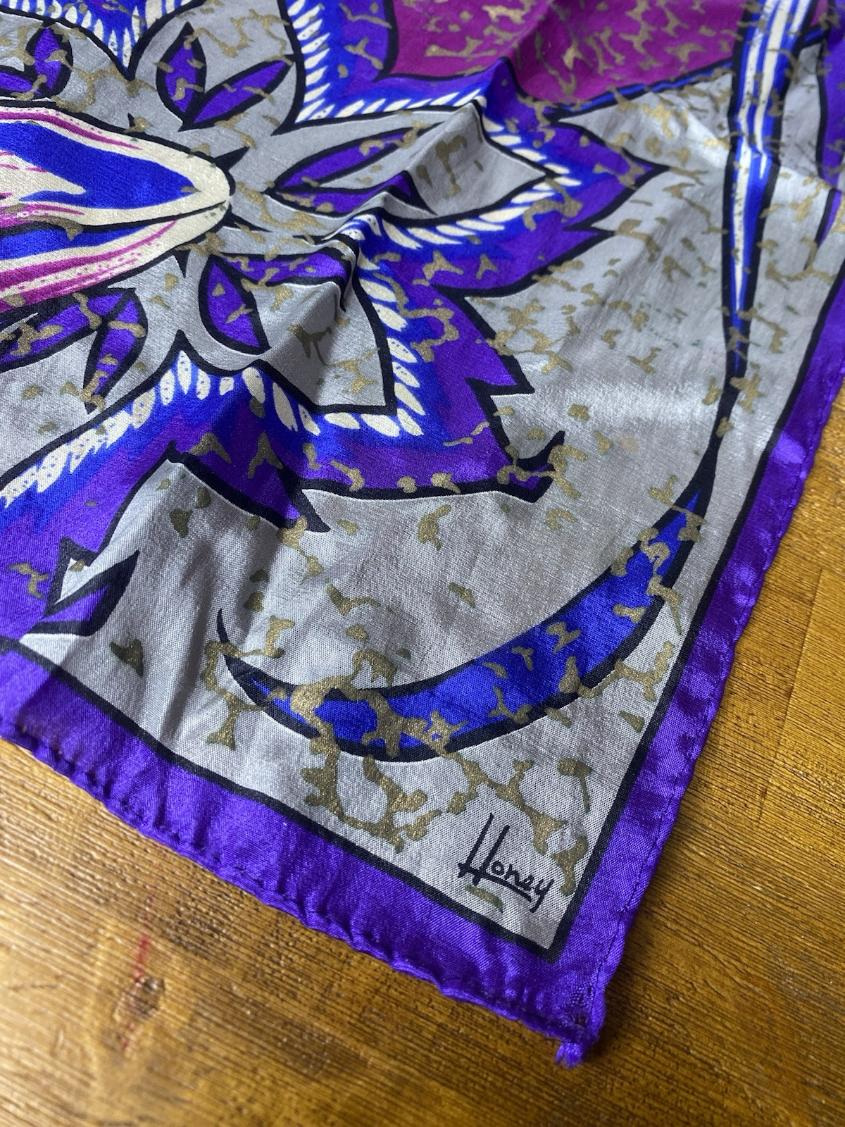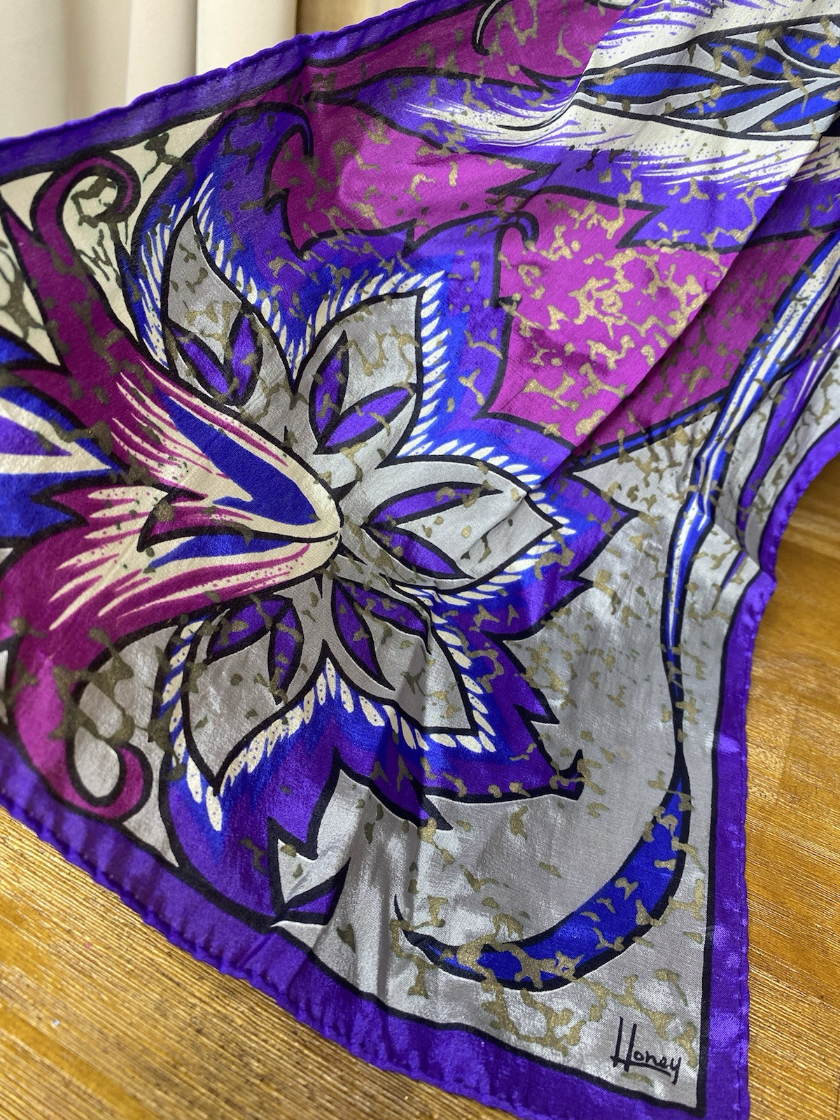 Vintage Silk Scarf By Honey Purple Floral Print Hand Rolled Hem 54 X 10