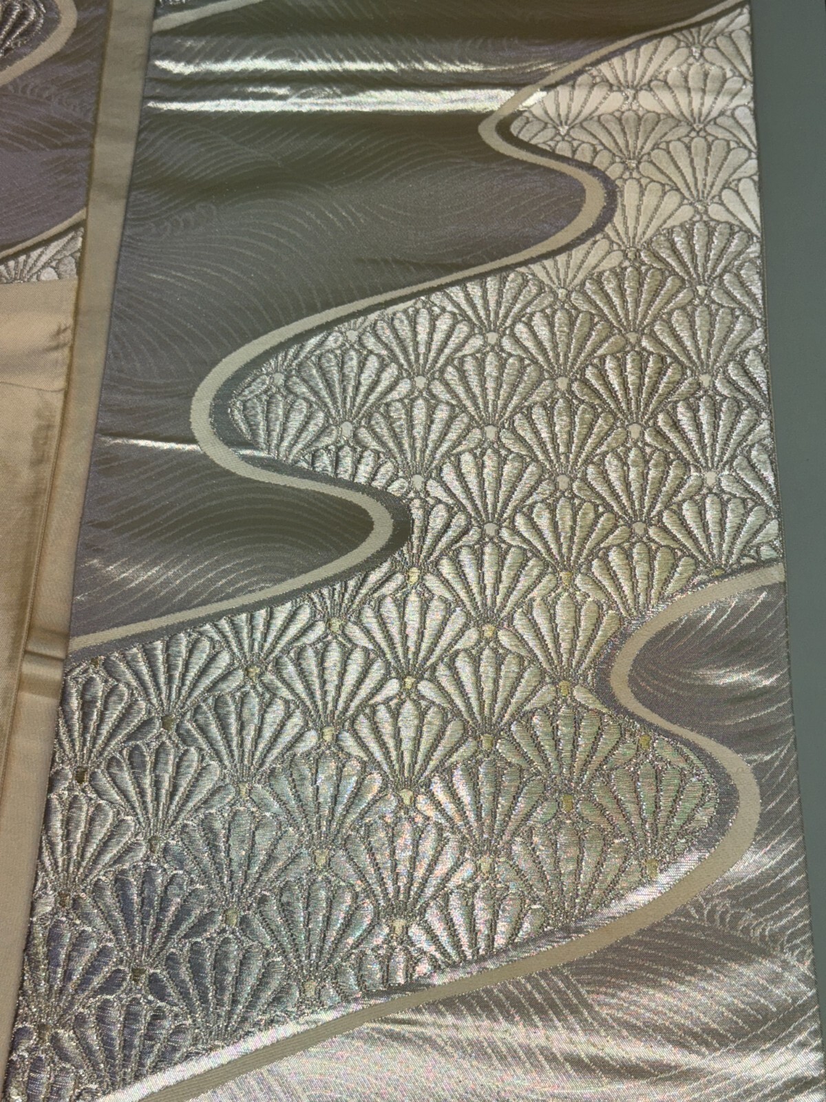 как выглядит Japanese Vintage Kimono Fukuro Obi Silk silver expensive embroidery 168.5x12.2in фото