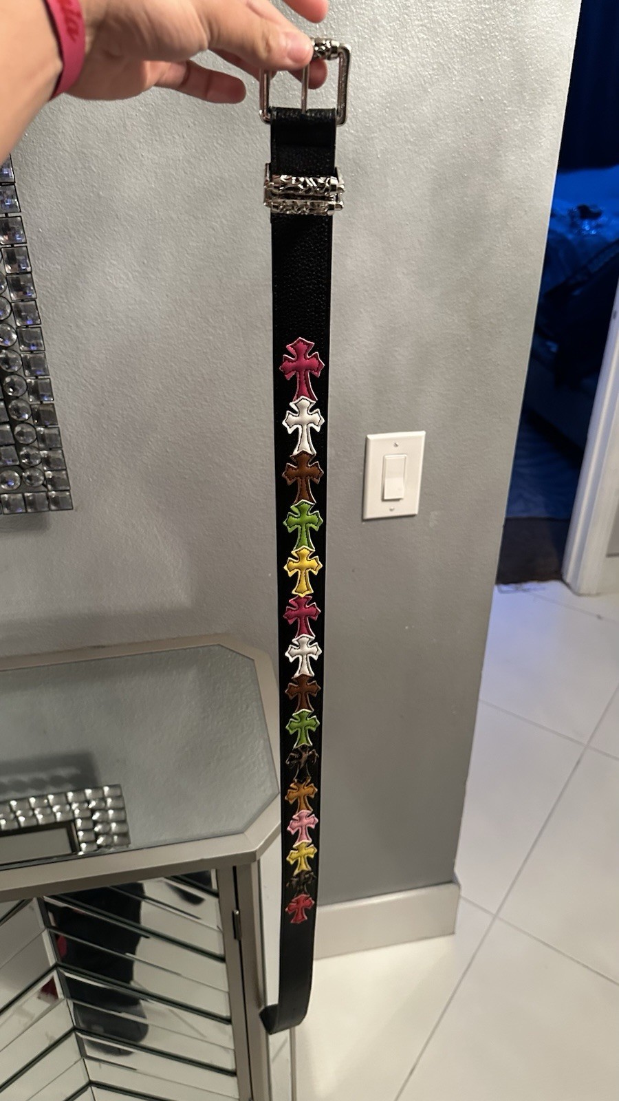 Chrome Hearts style black leather belt w/ silver chrome buckle w/ colorful cross