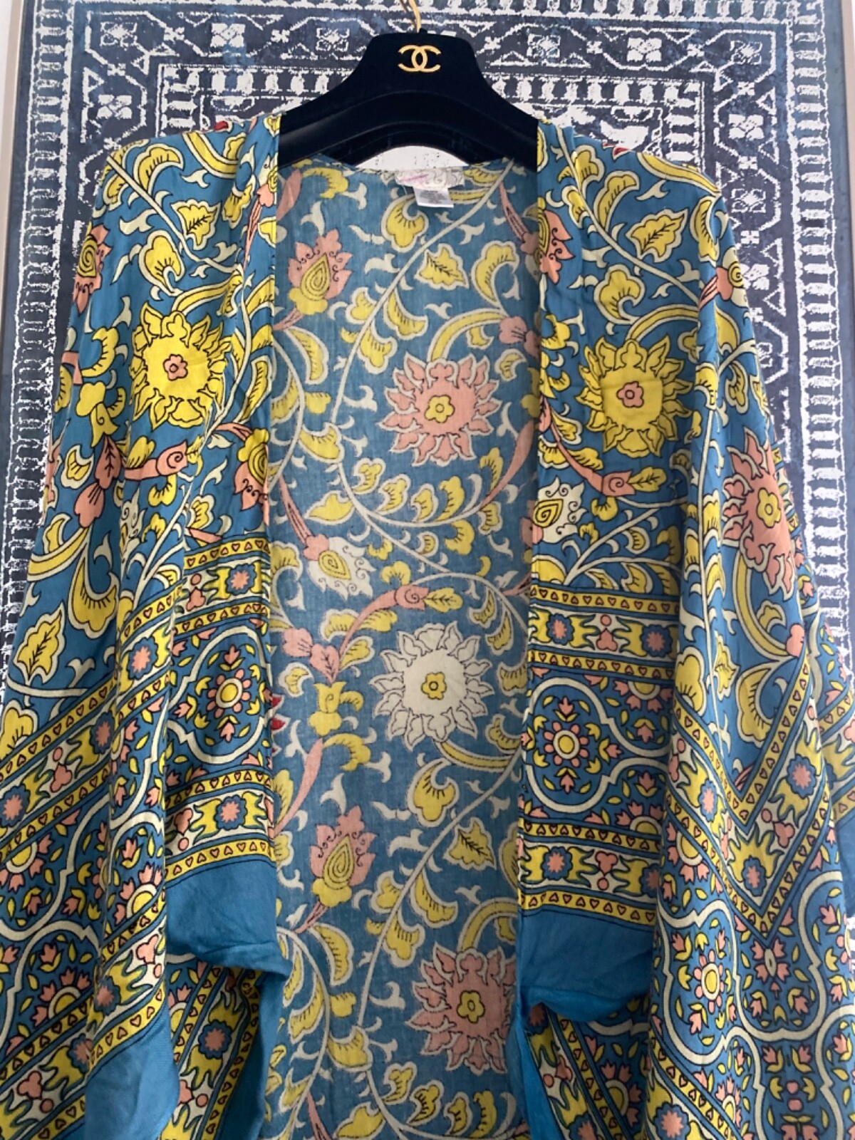 как выглядит New Free People Beautiful Magic Dance Border Print Kimono Blue Combo OS фото