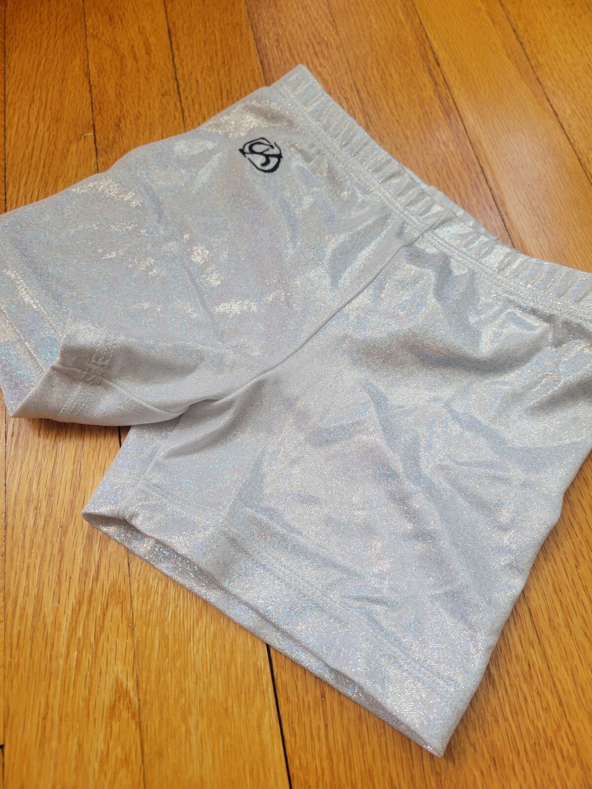 GK Elite Metallic White Silver Gymnastics Bar Length Shorts SPANDEX Adult XS AP