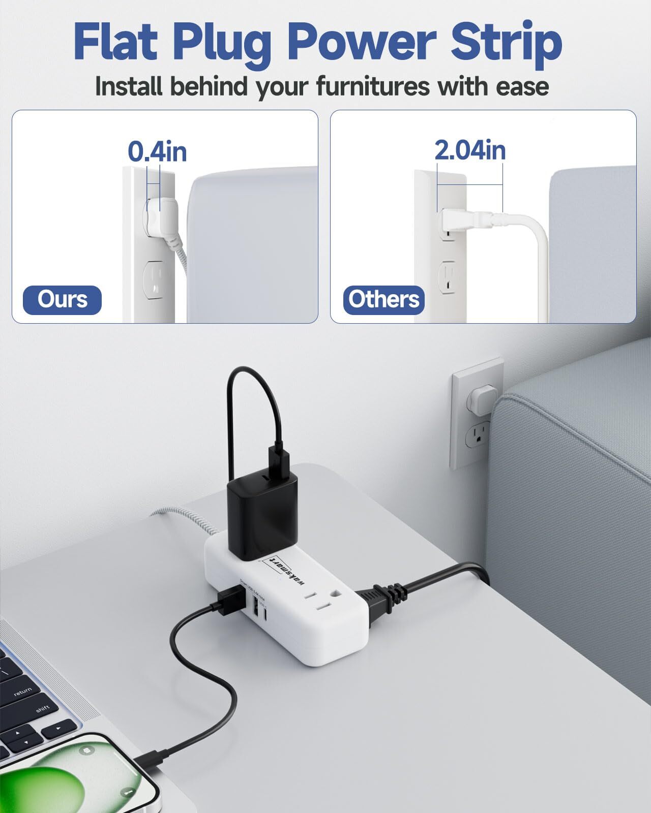 Flat Extension Cord 25FT 4 AC Outlets 3 USB Ports 5V/3.4A 17W Braided Cord