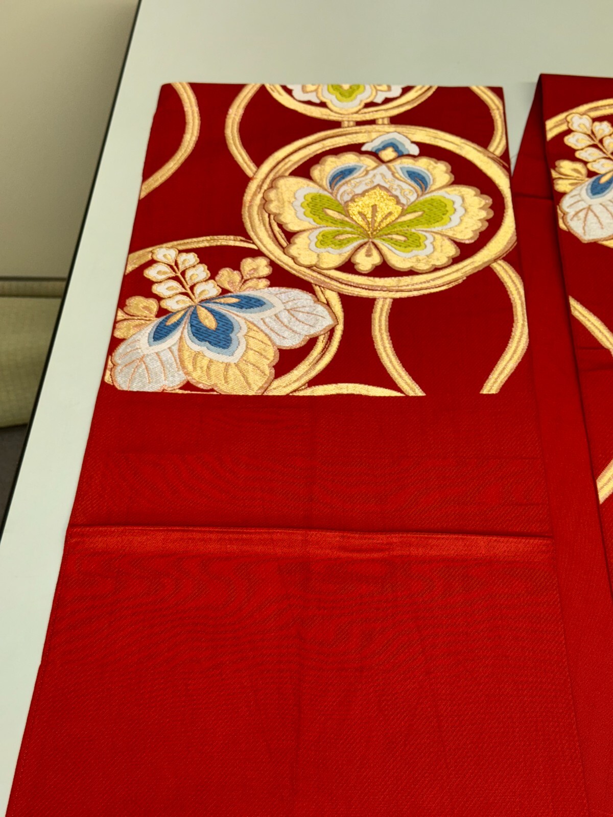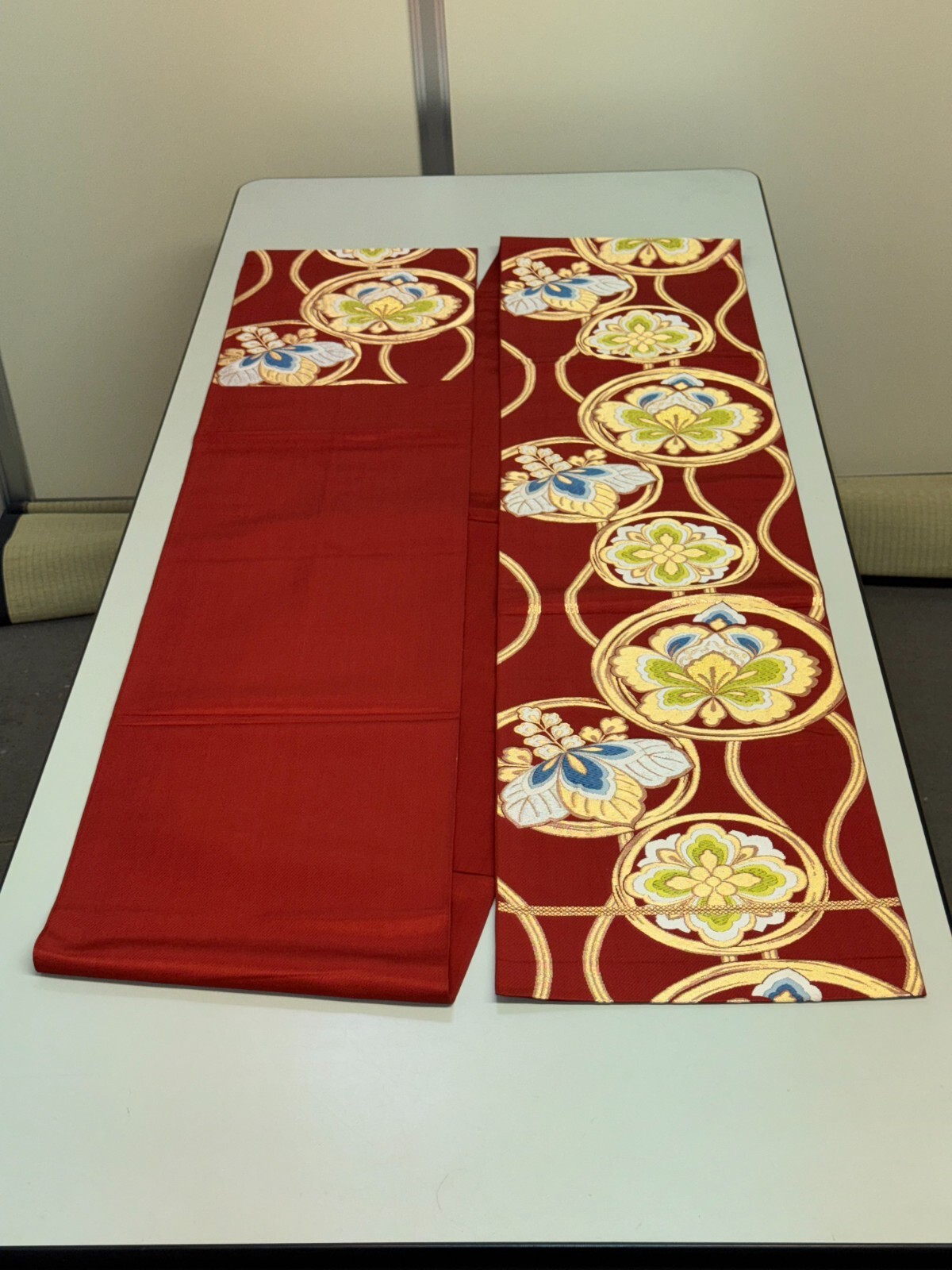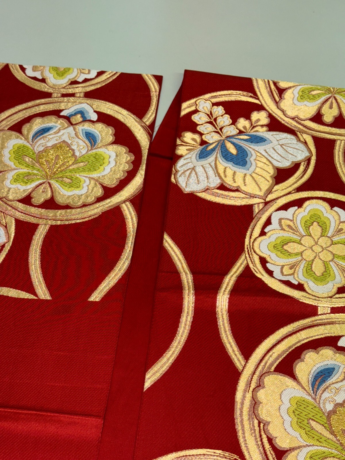 как выглядит Japanese Vintage Kimono Fukuro Obi silk red expensive embroidery 158.2x12.2in фото