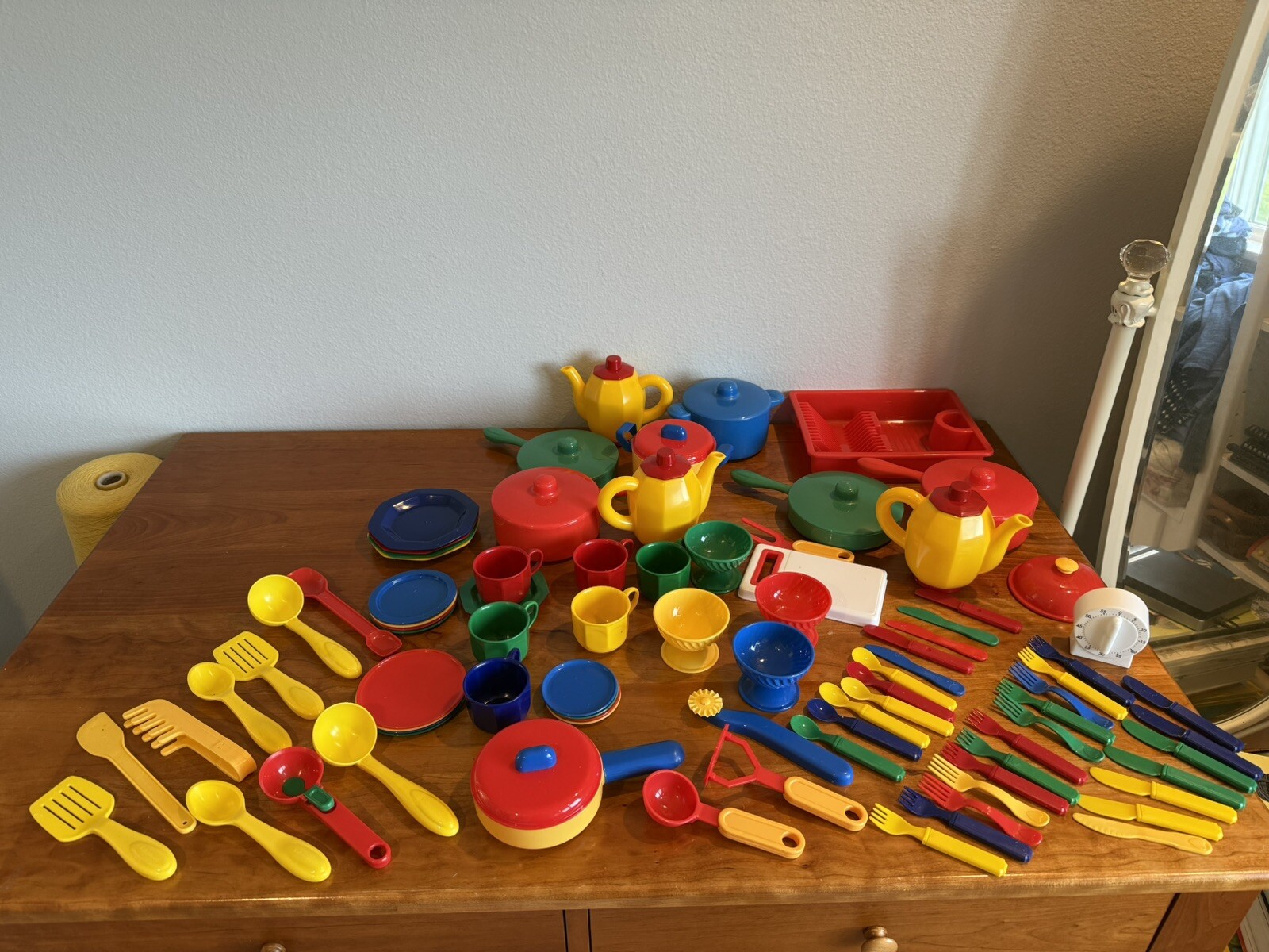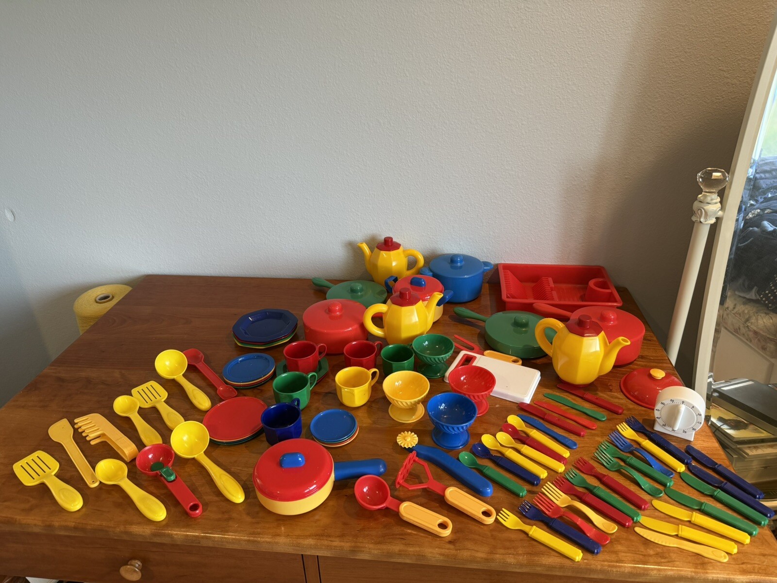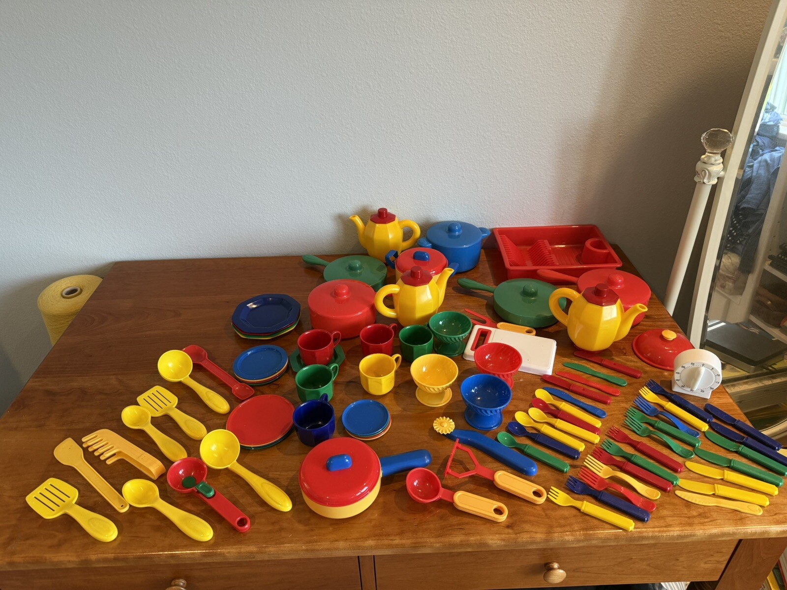 Large multicolor set of children's play kitchen dishes pans silverware utensils