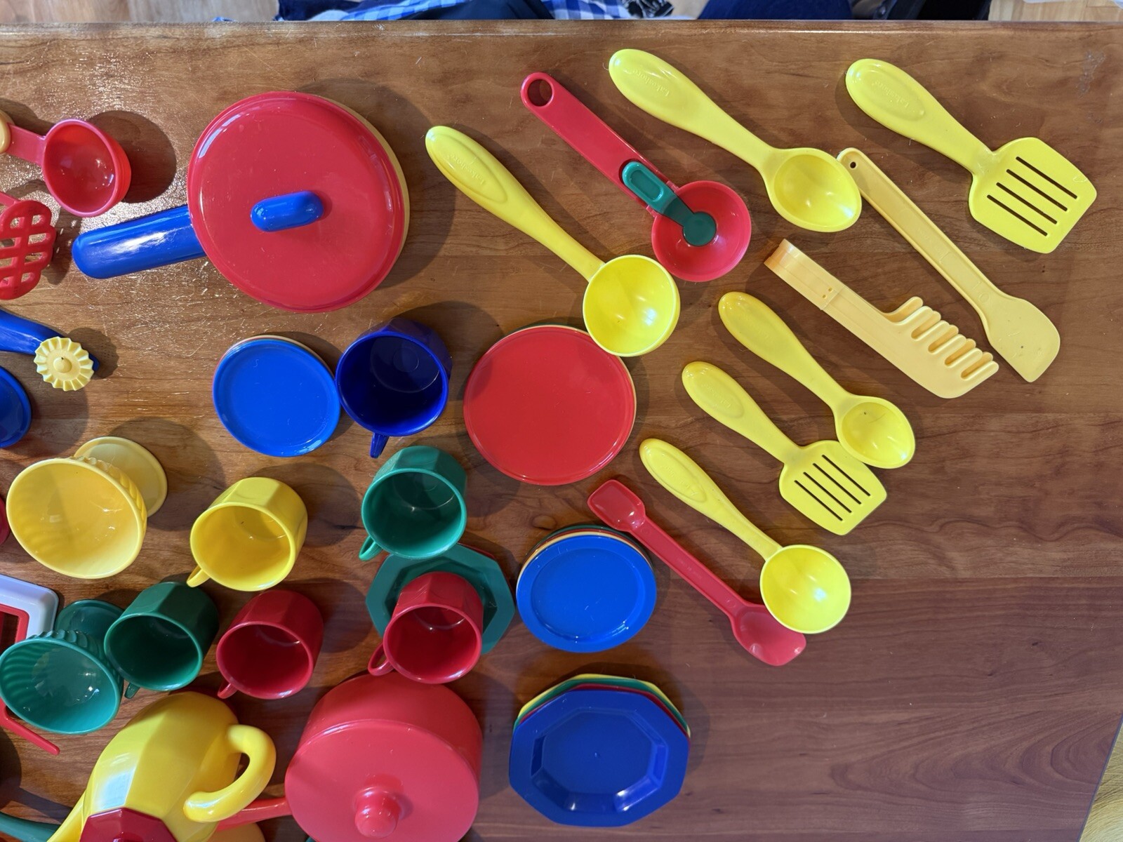 как выглядит Large multicolor set of childrens play kitchen dishes pans silverware utensils фото