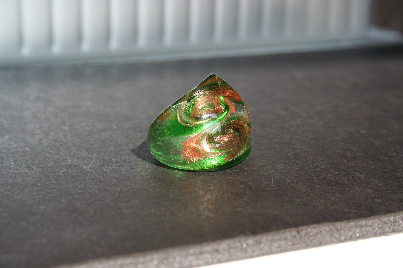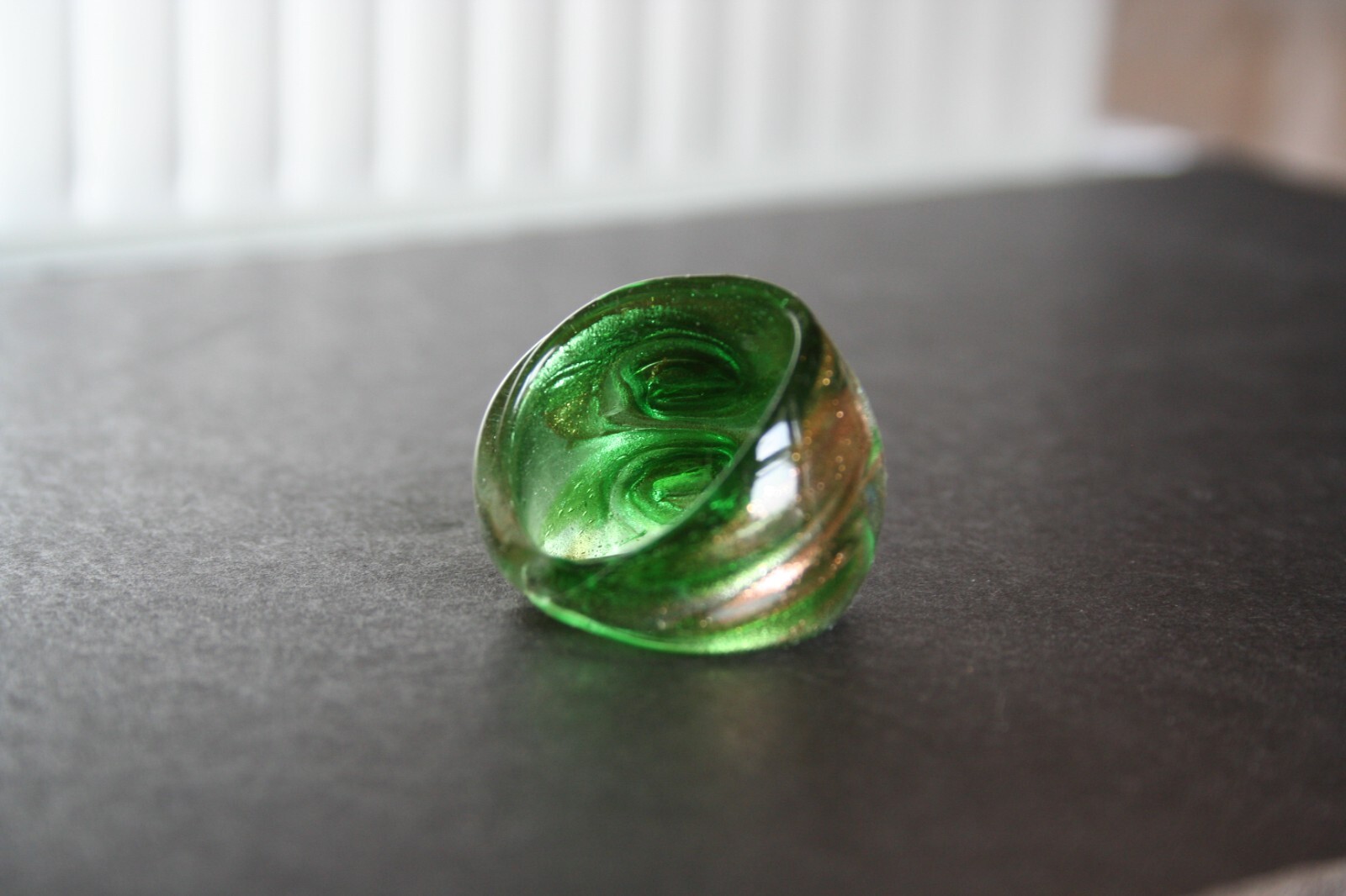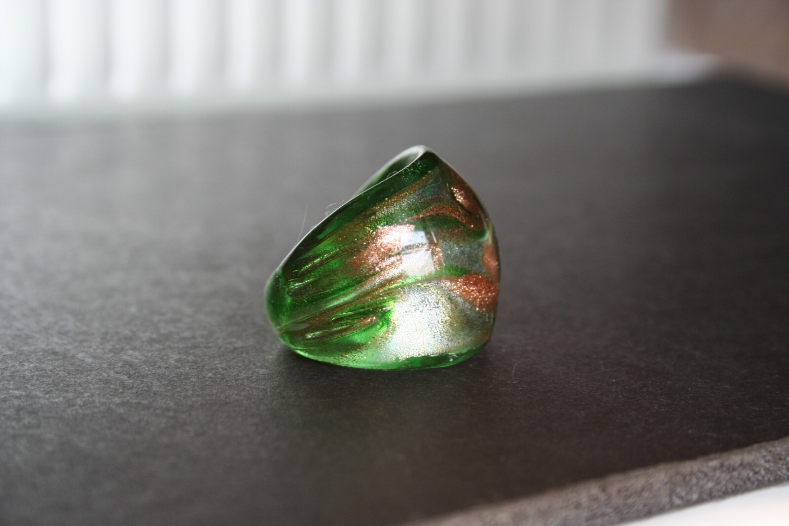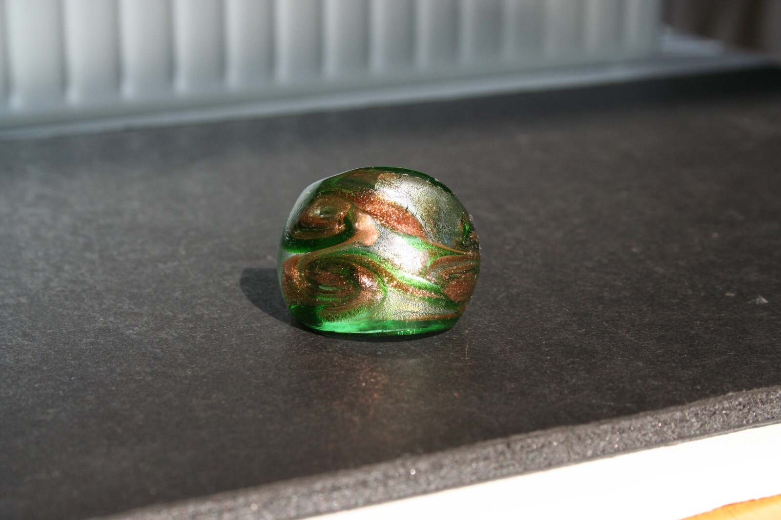 Murano-style art glass dome cocktail ring, size 8, green swirls, gold metallic