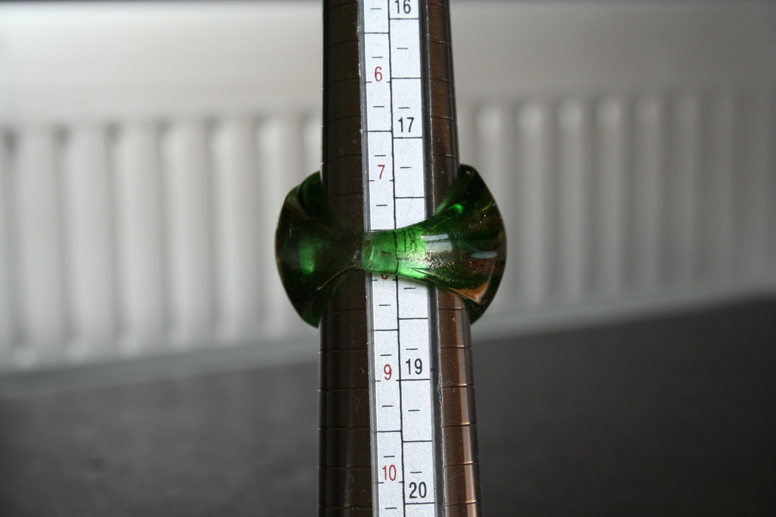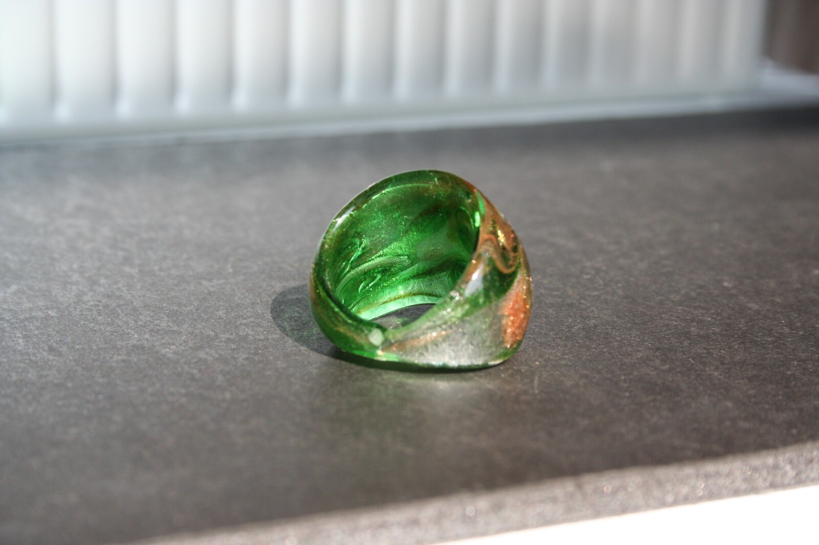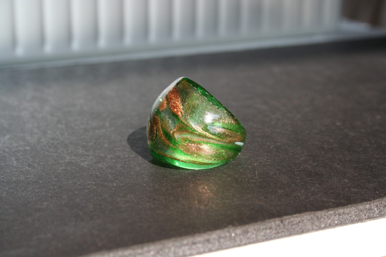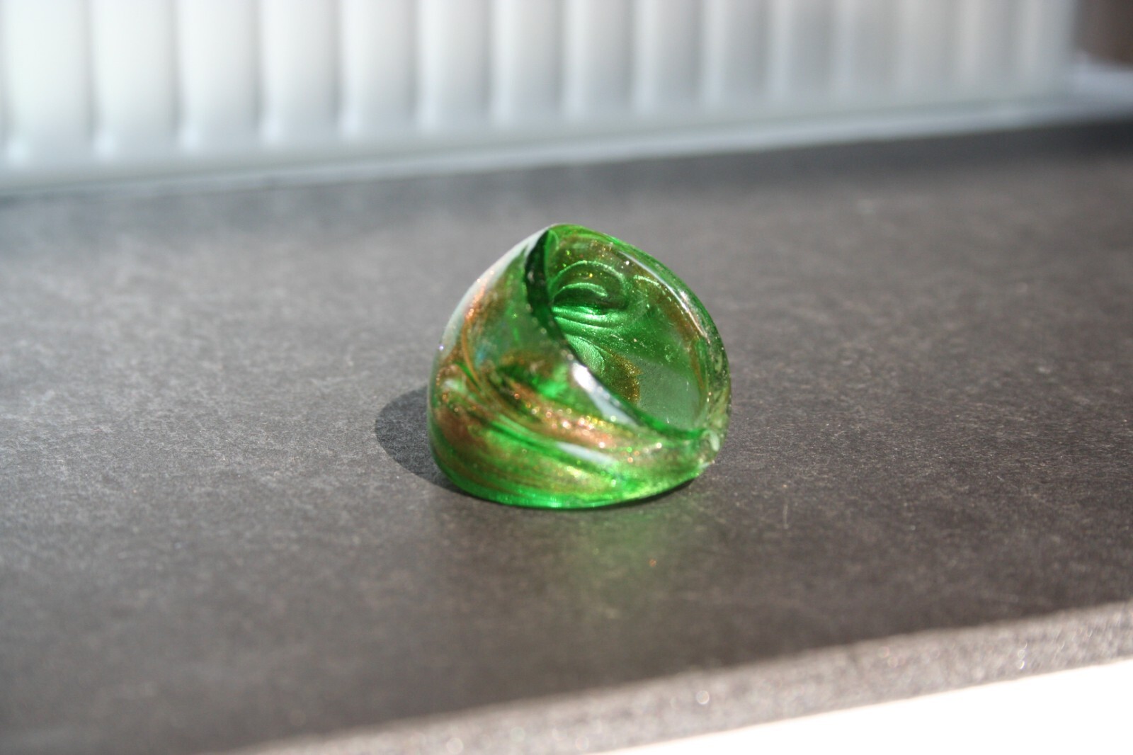 Murano-style art glass dome cocktail ring, size 8, green swirls, gold metallic