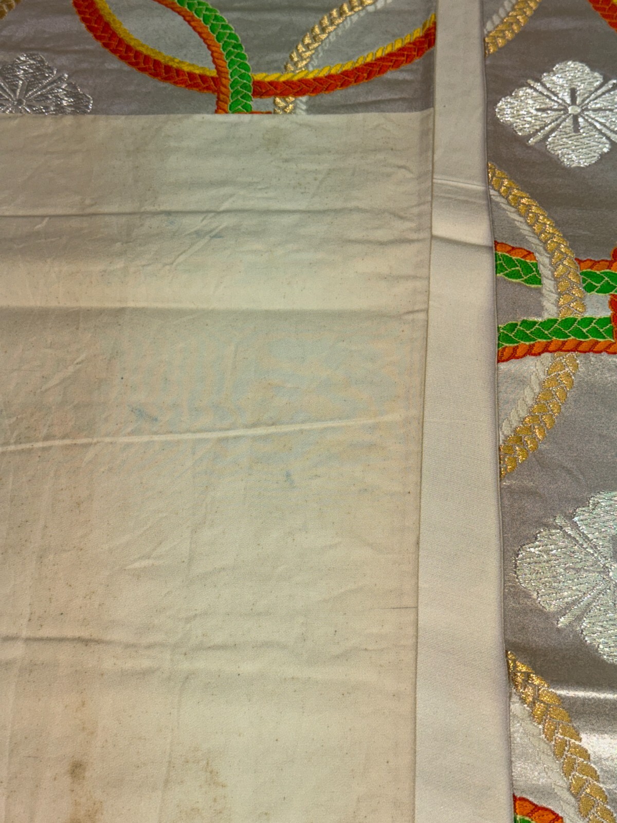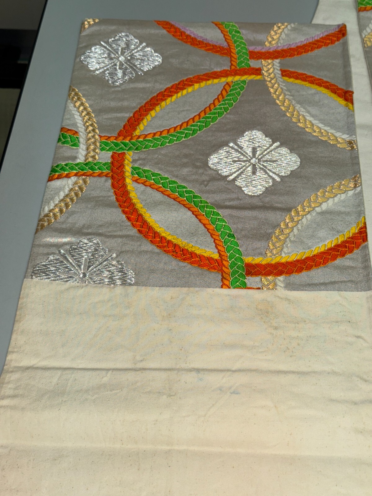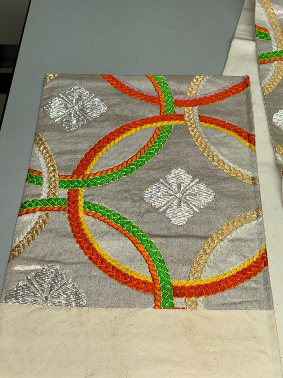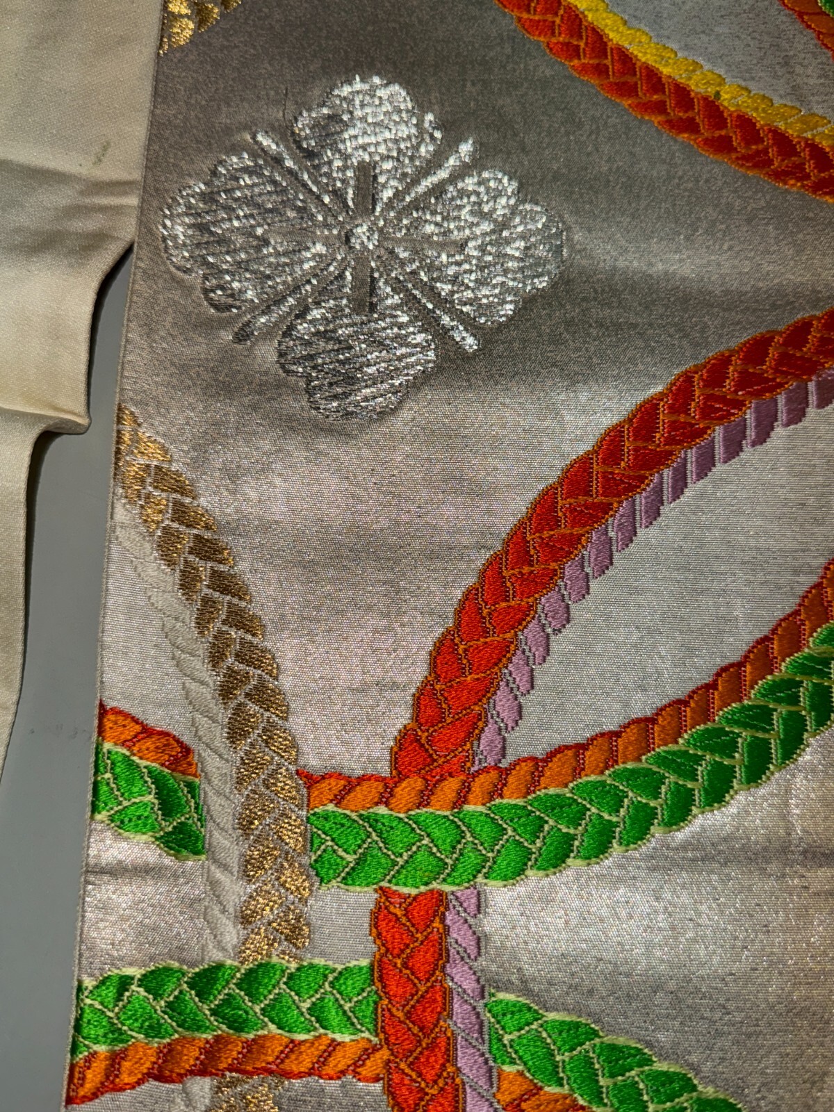 как выглядит Japanese Vintage Kimono Fukuro Obi silk Silver expensive Embroidery Dirt164x11in фото