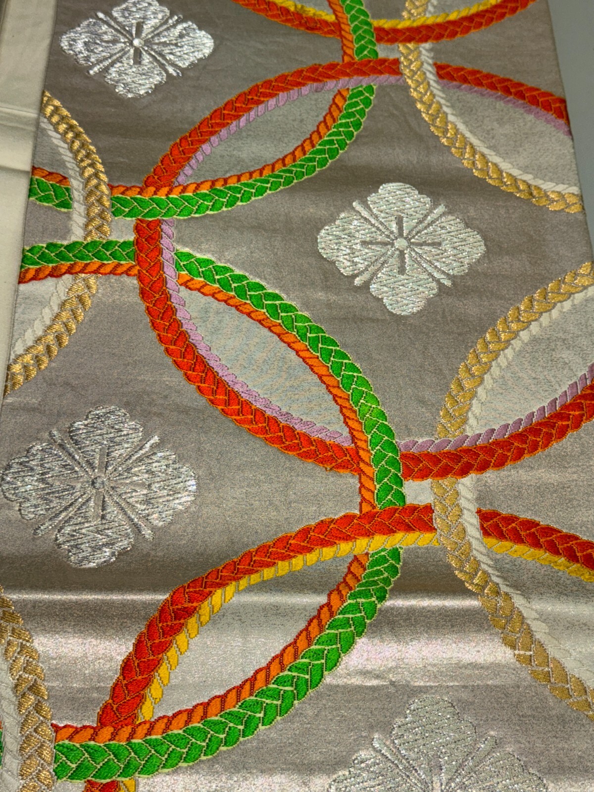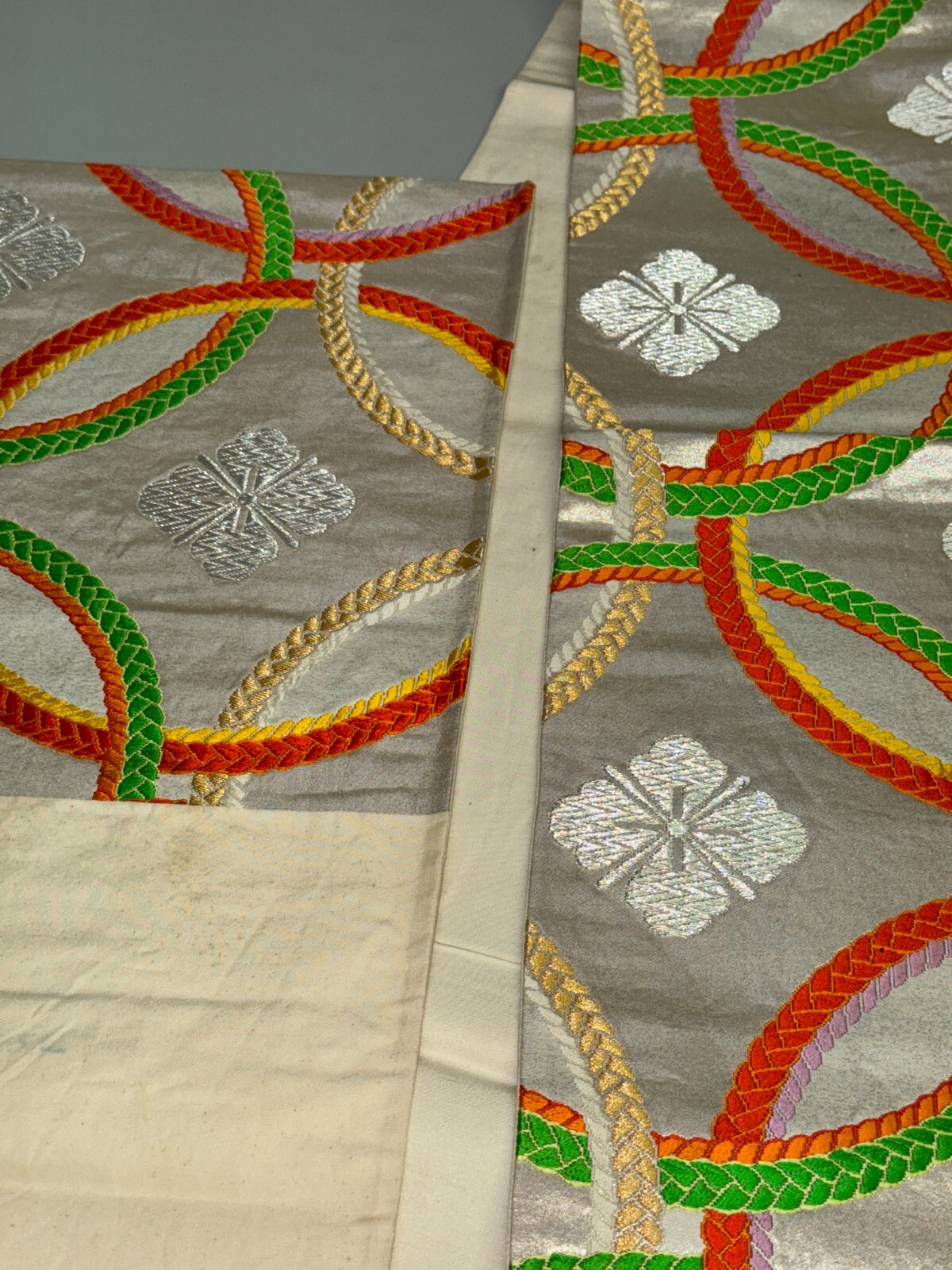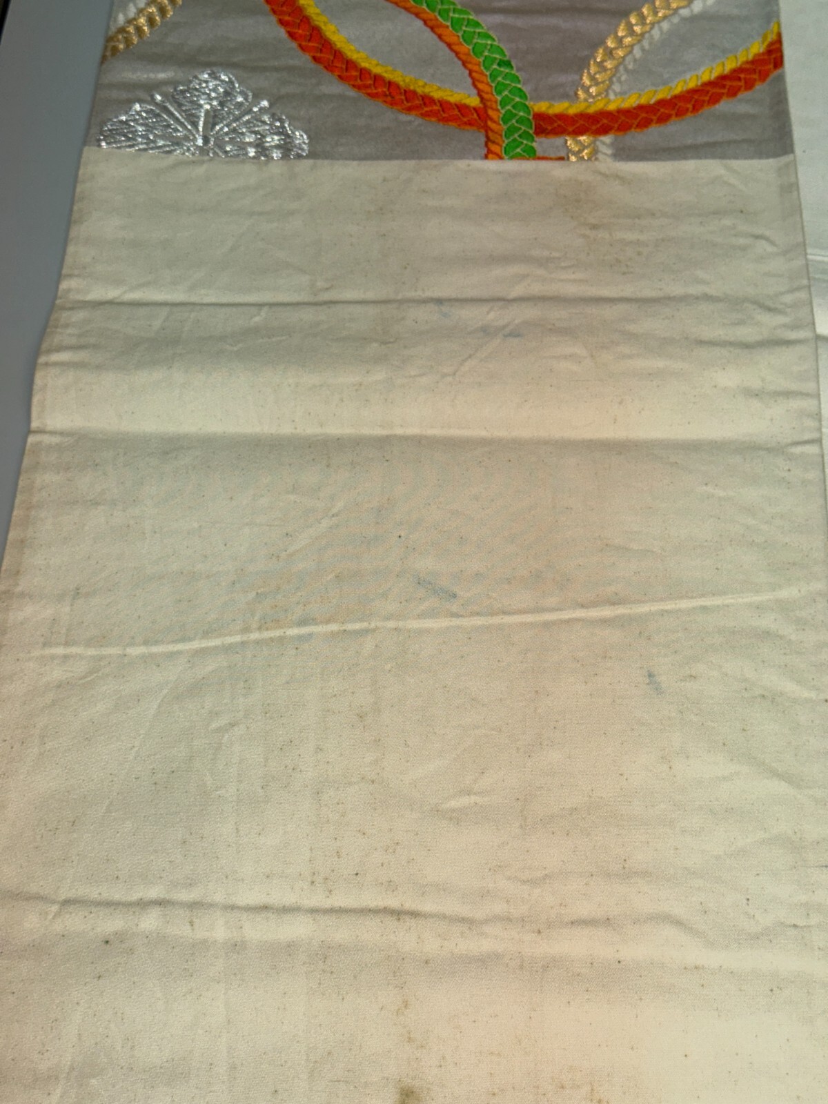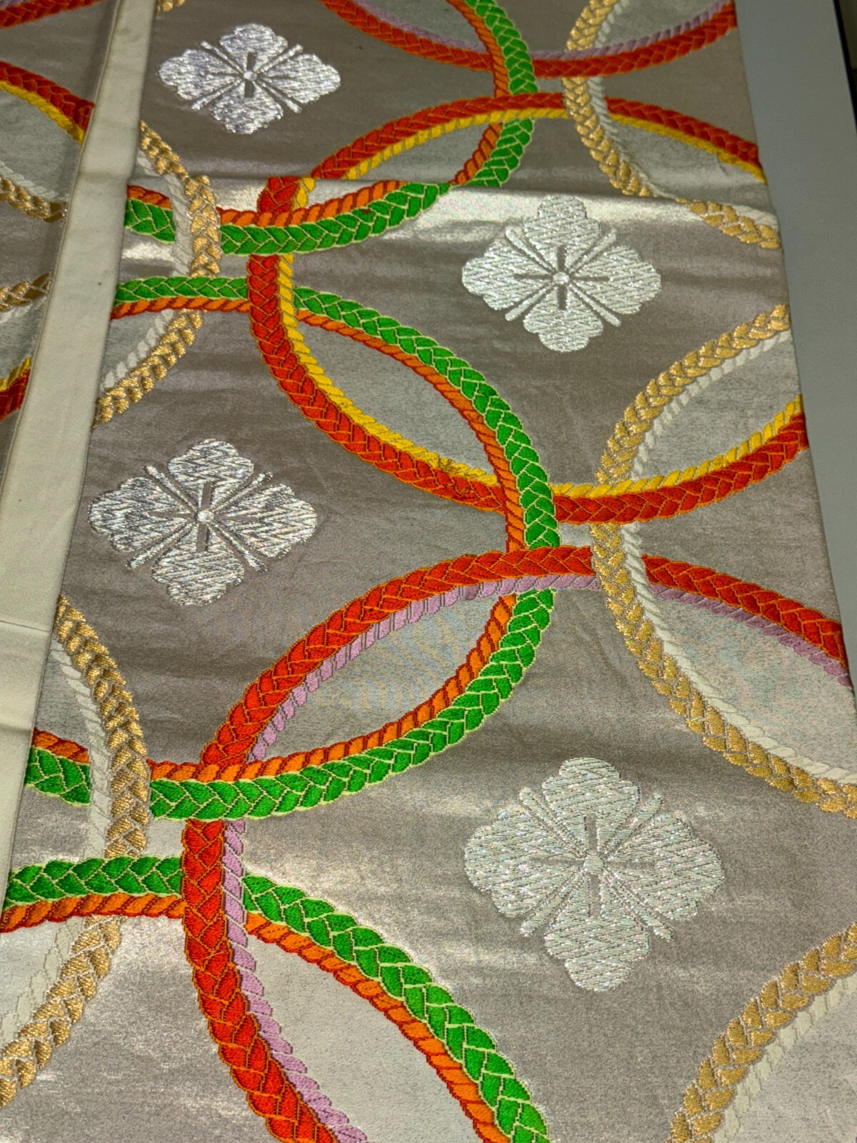 как выглядит Japanese Vintage Kimono Fukuro Obi silk Silver expensive Embroidery Dirt164x11in фото