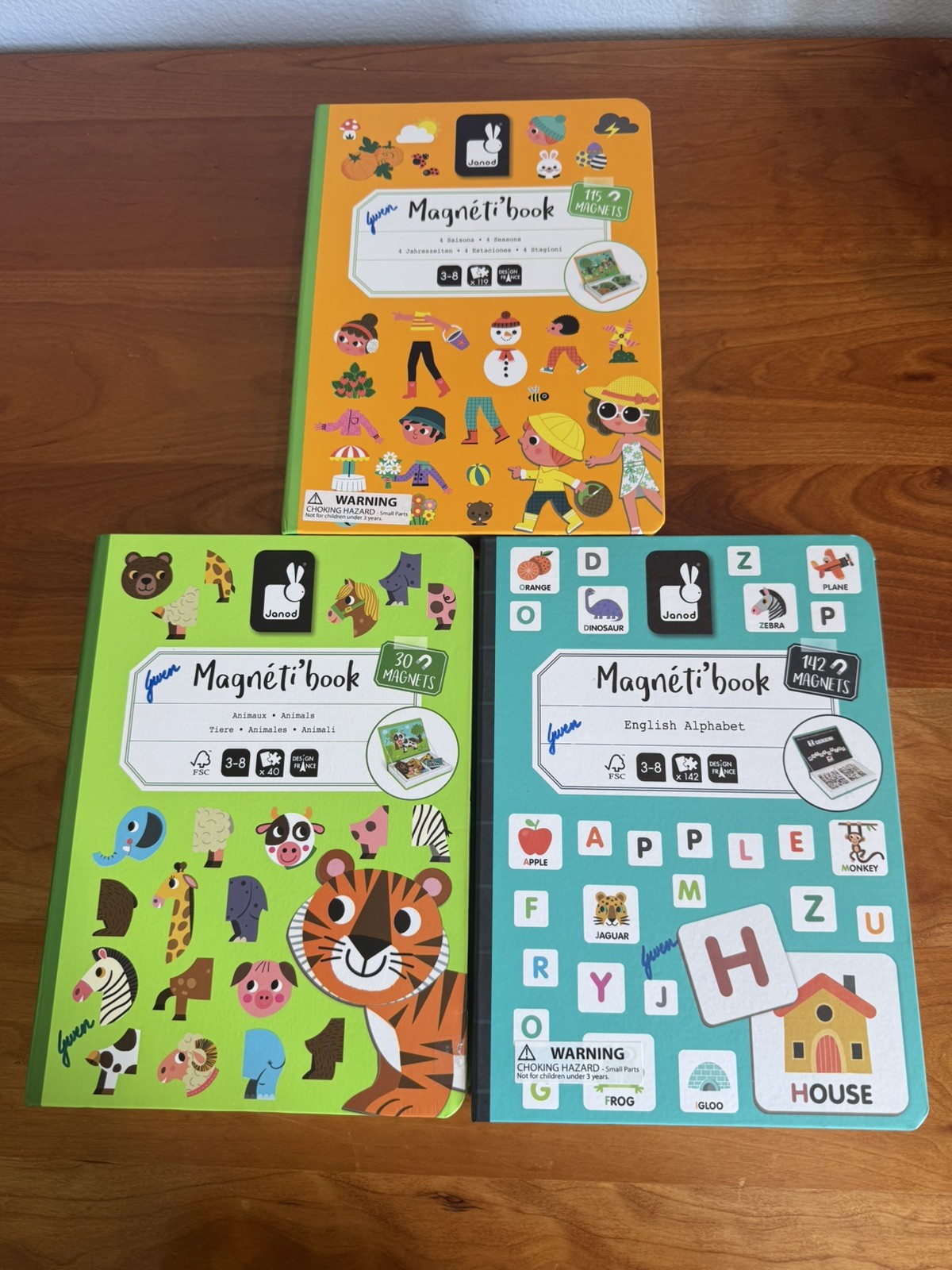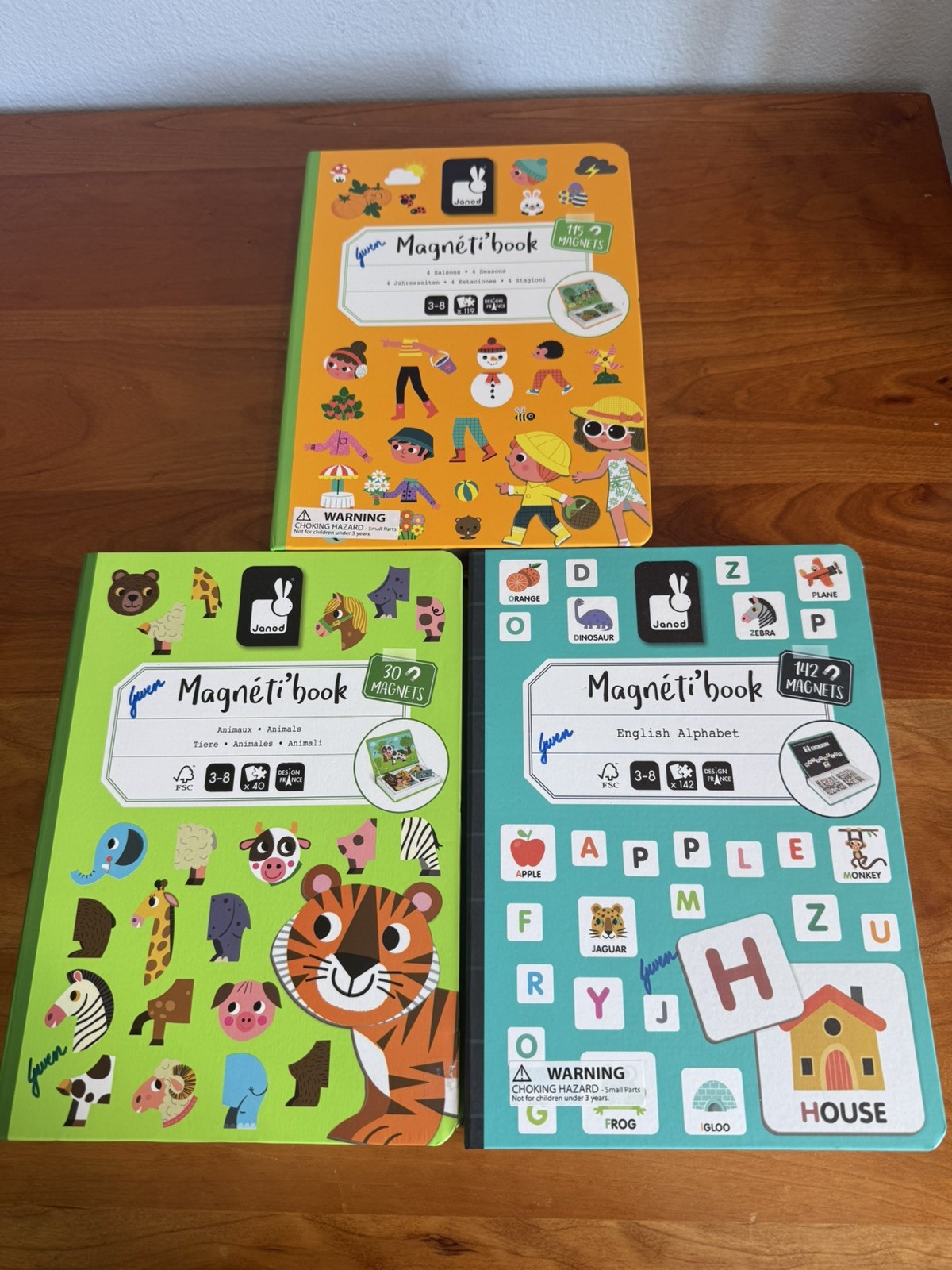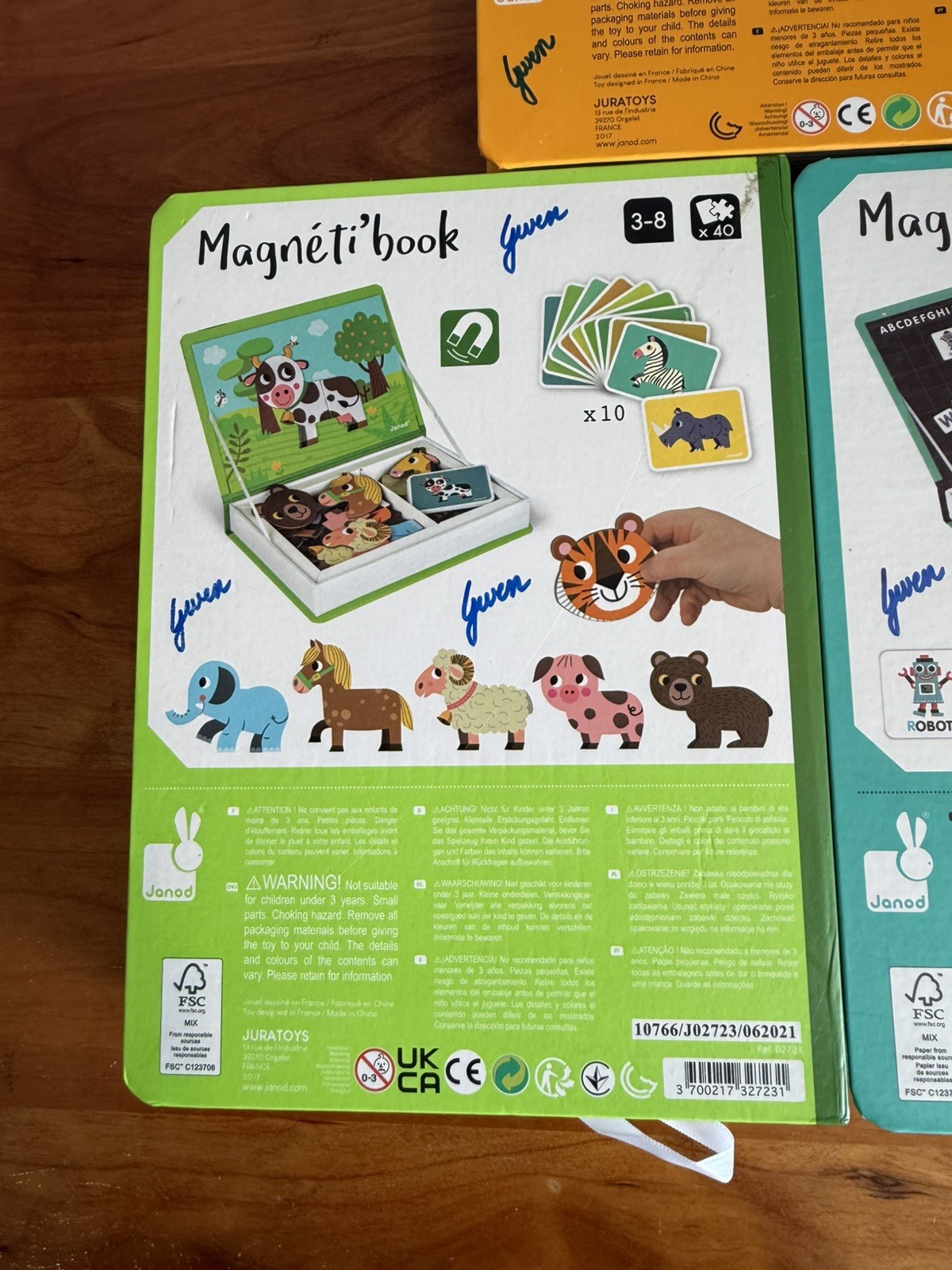 • Set of 3 excellent Janod Magneti' activity books: Animals, 4 Seasons Alphabet