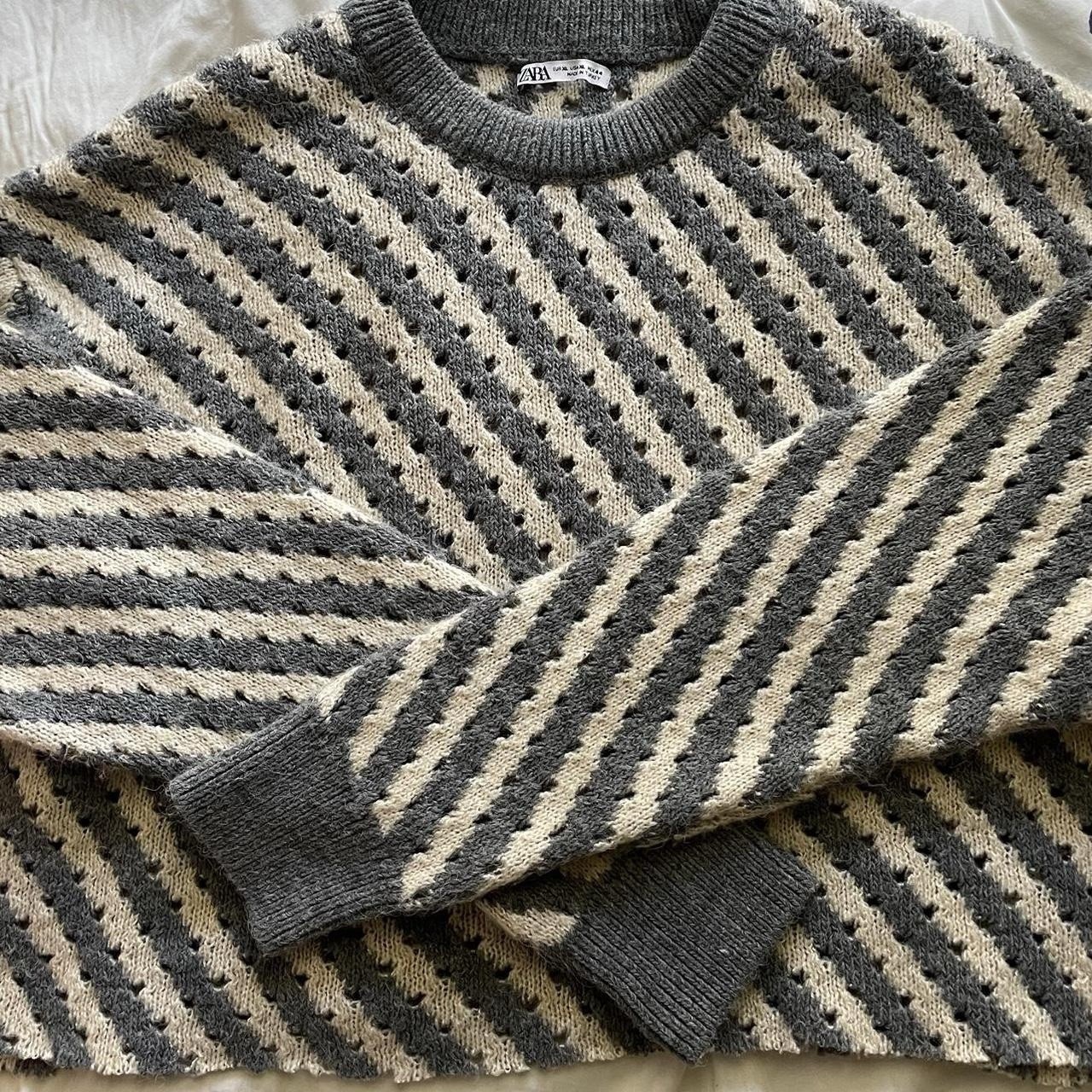 как выглядит ZARA Men s Gray White Striped Knit Sweater Pullover Size Large L фото