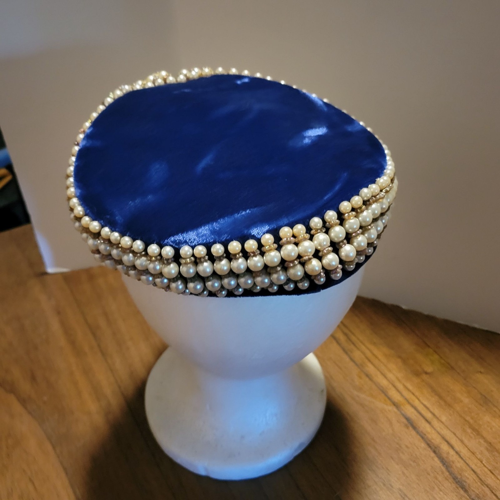 как выглядит Vintage Clover Lane Blue Velvet Hat With Faux Pearl Trim Midcentury Modern Glam фото