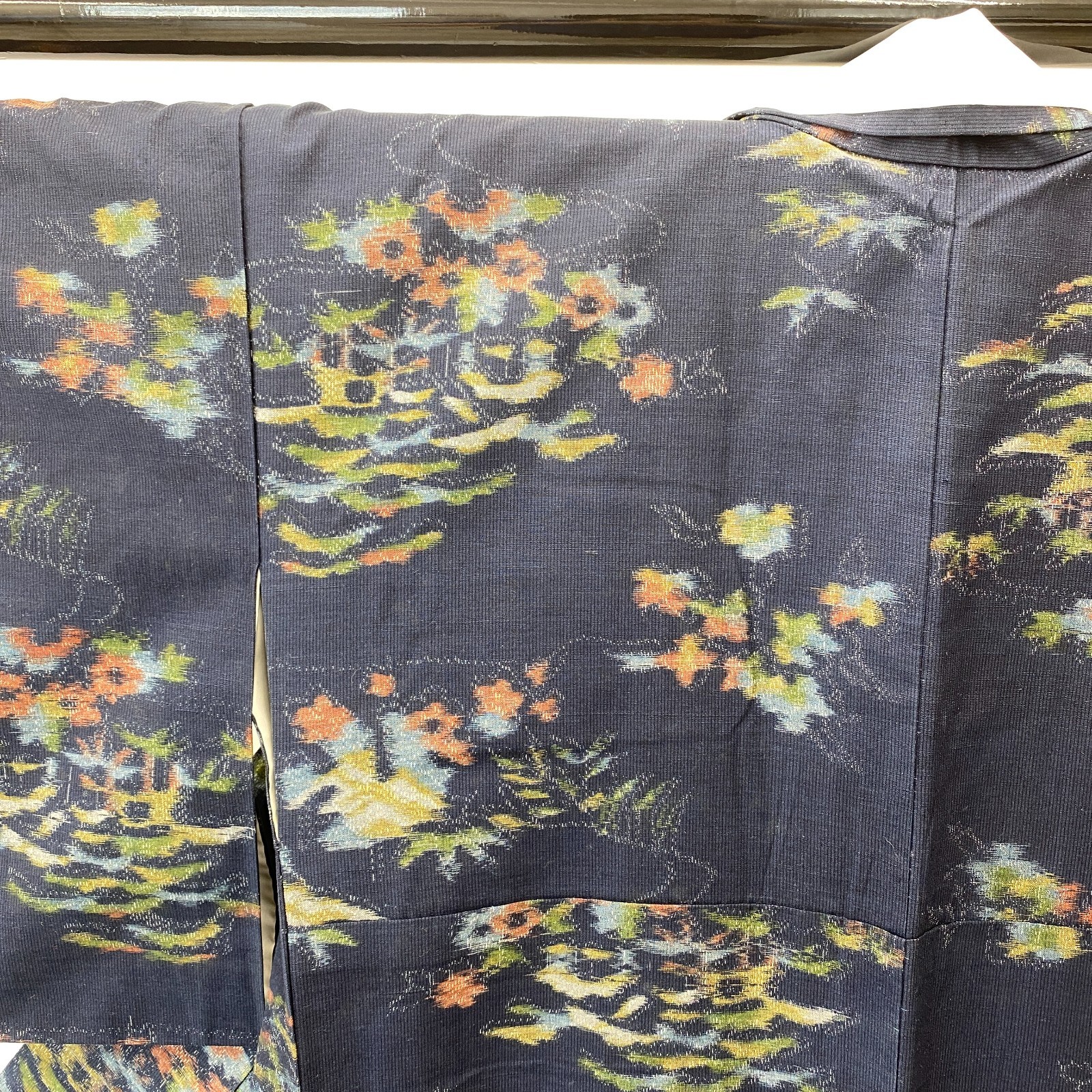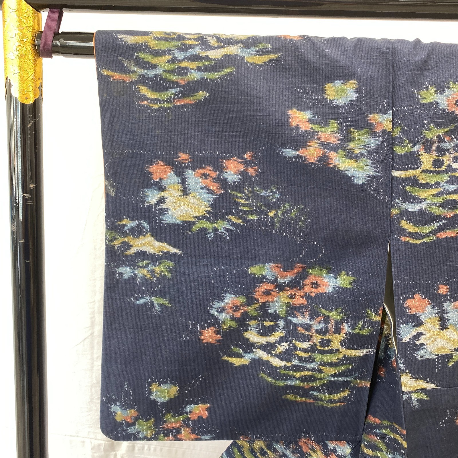 Japanese Vintage Kimono Silk Navy Tumugi Traditional Authentic Length 63in
