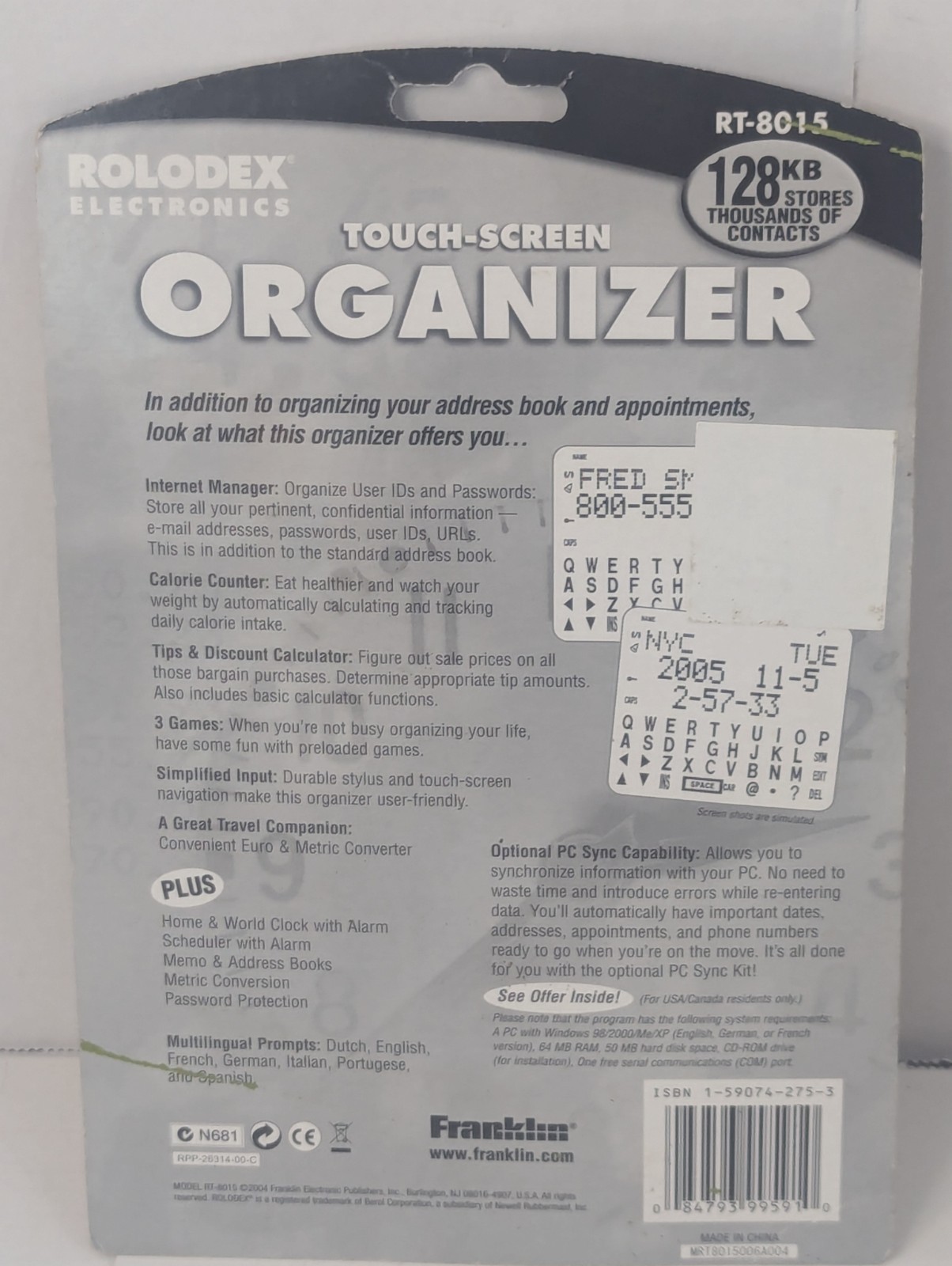 Rolodex Electronics Touch Screen Organizer with Stylus RT-8015 Franklin 2004 NIB