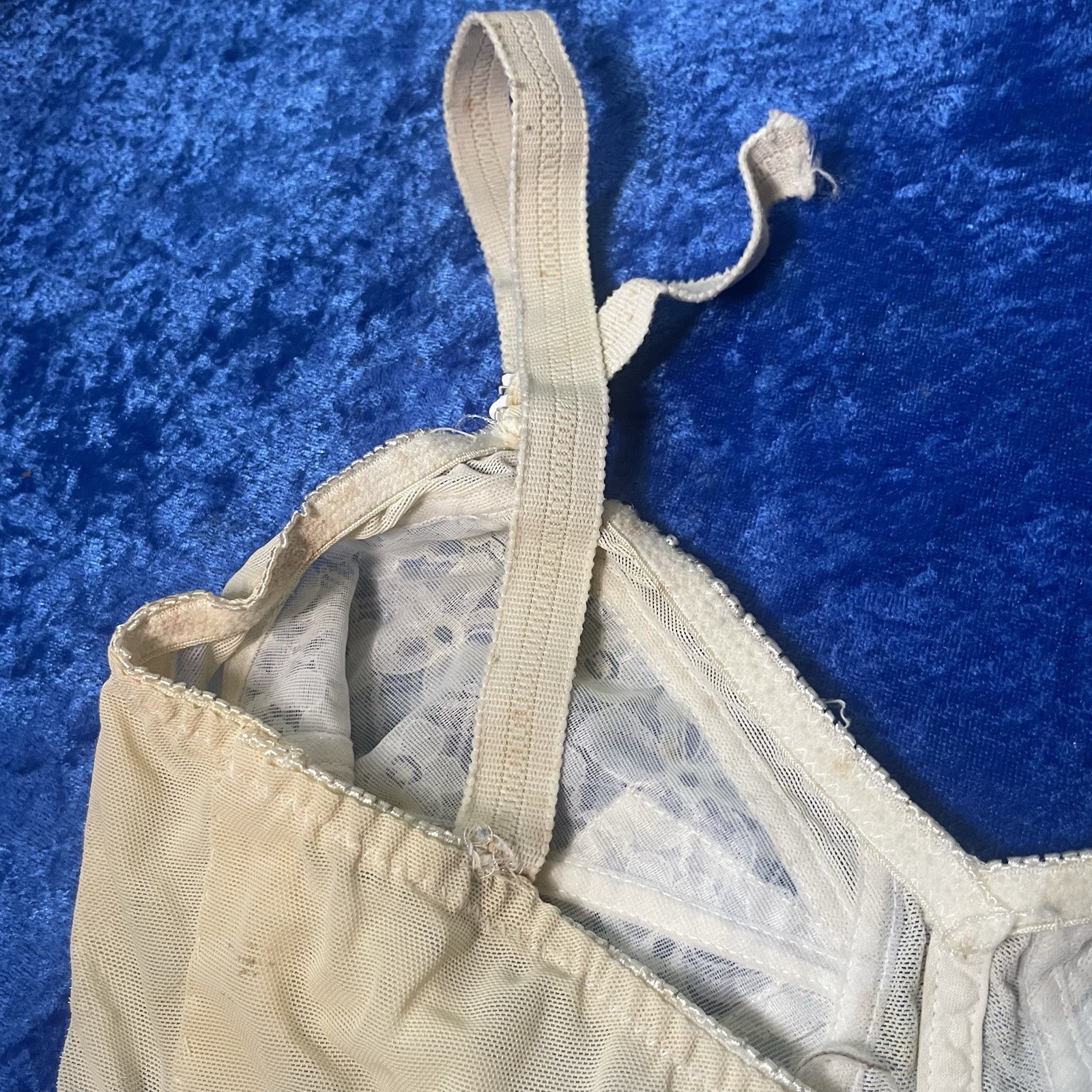 как выглядит Vintage Kiki Bullet Bra 38c Beige Lace Pinup Lingerie Stains See Pics As Is фото
