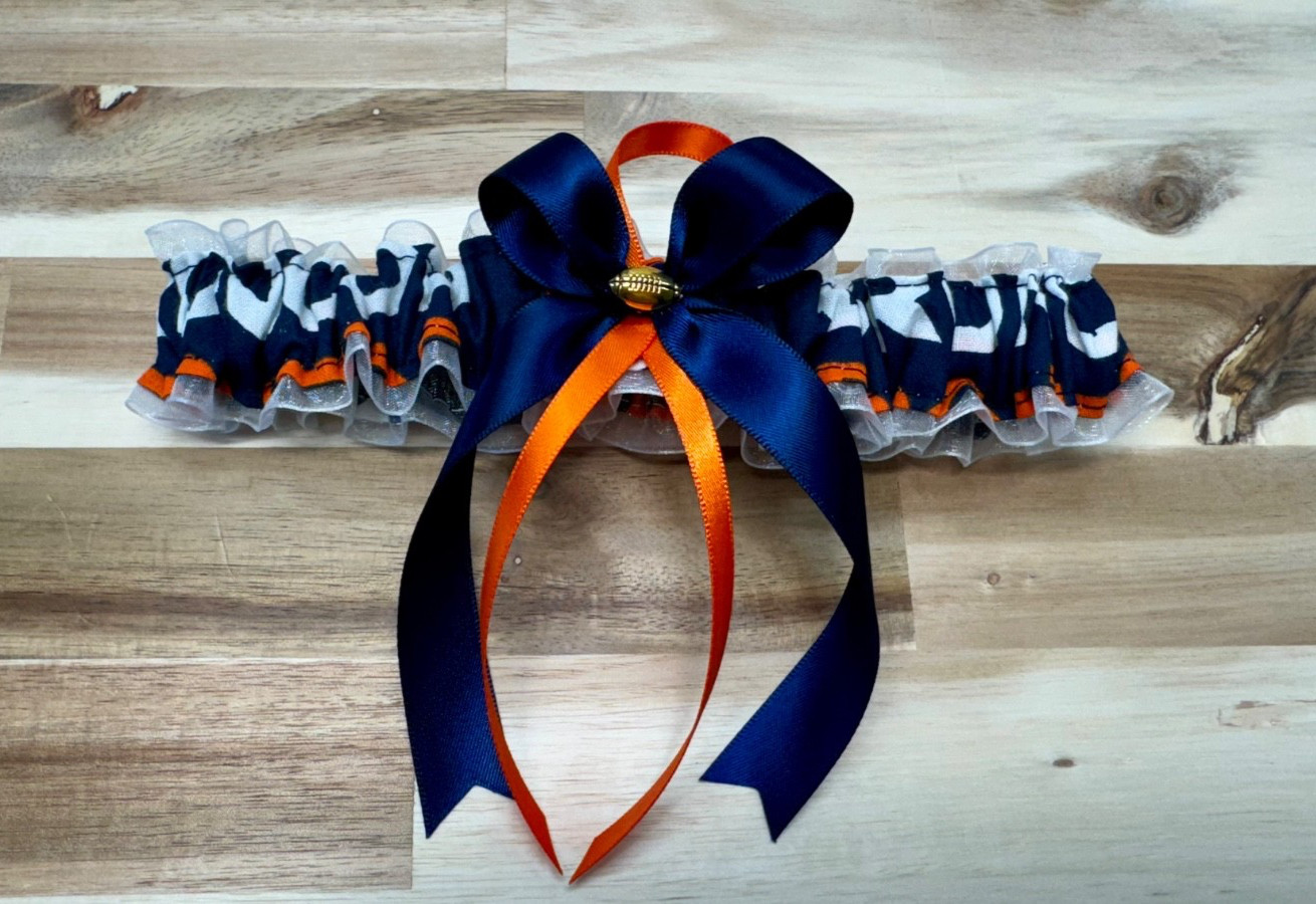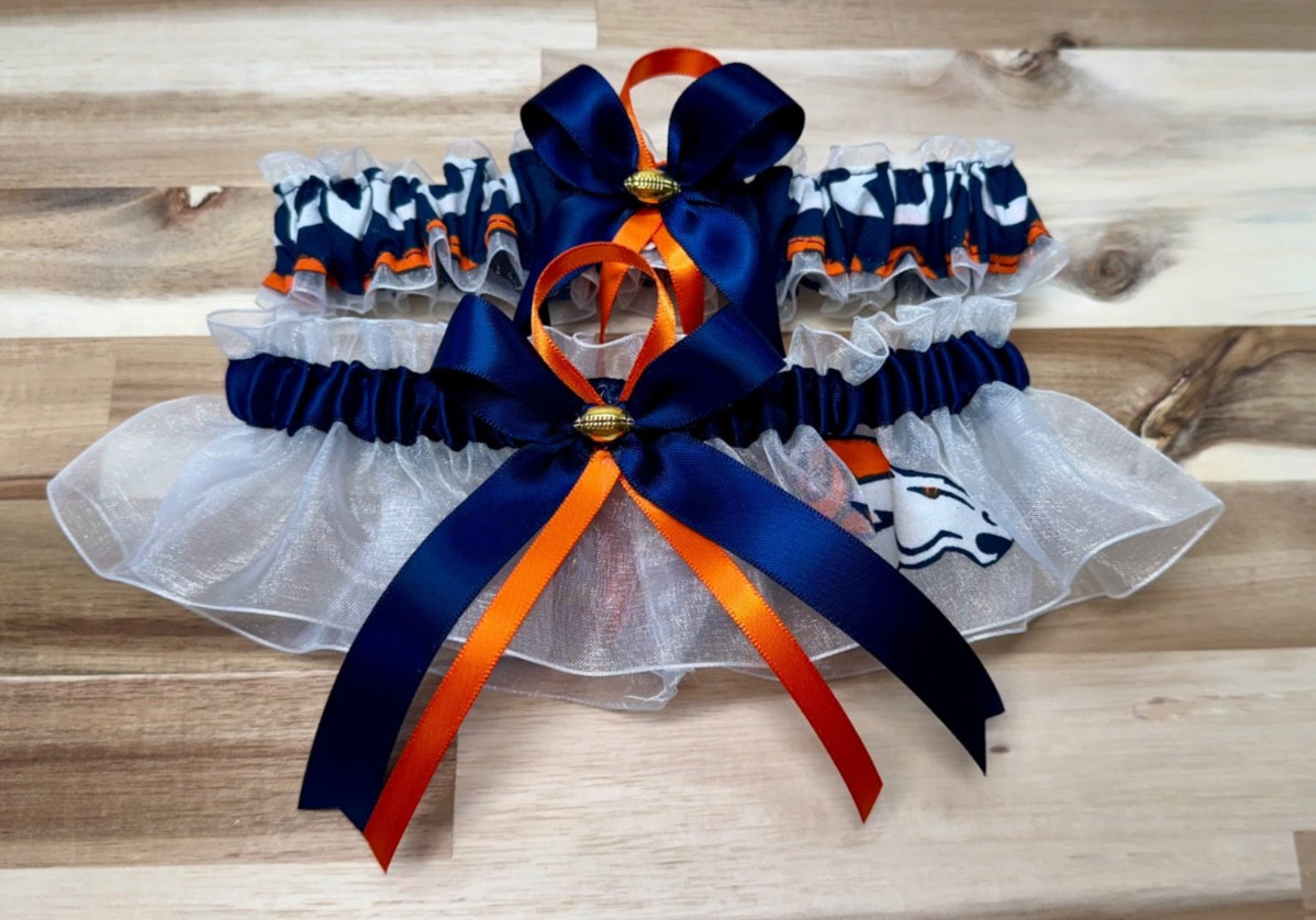 HANDMADE NFL Denver Broncos Set of 2 White Organza Navy Ribbon Wedding GARTER