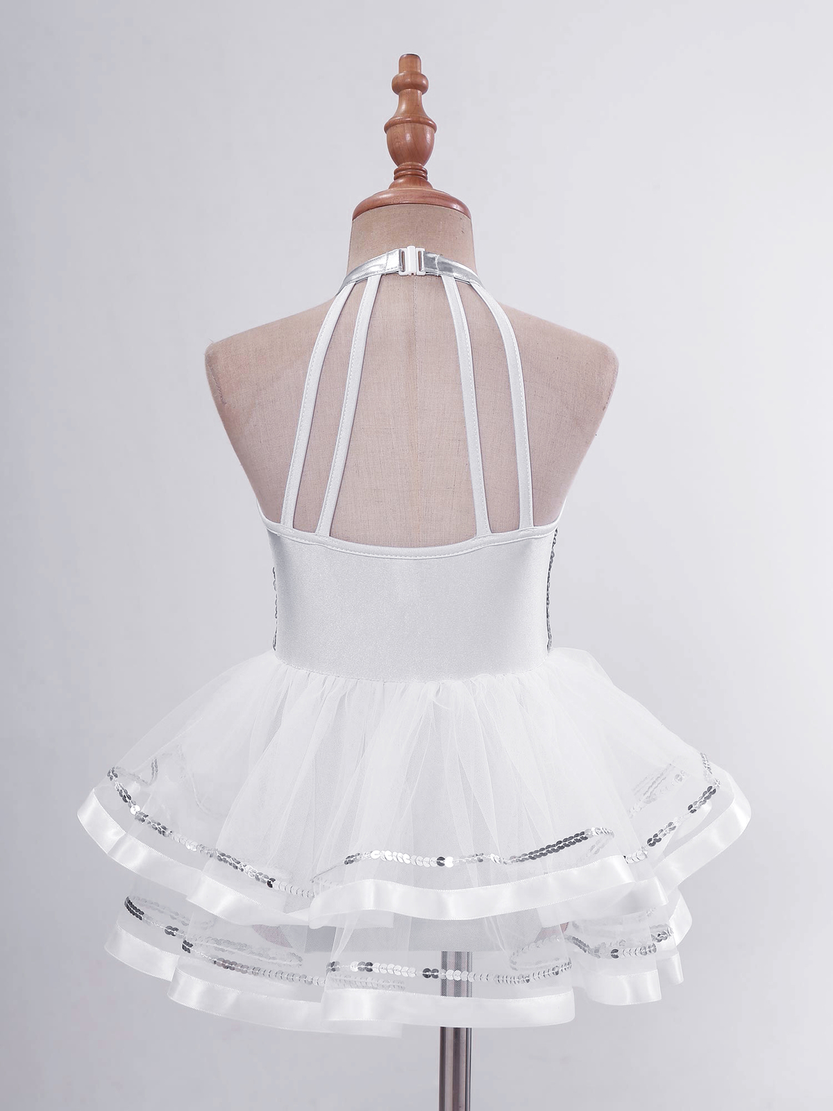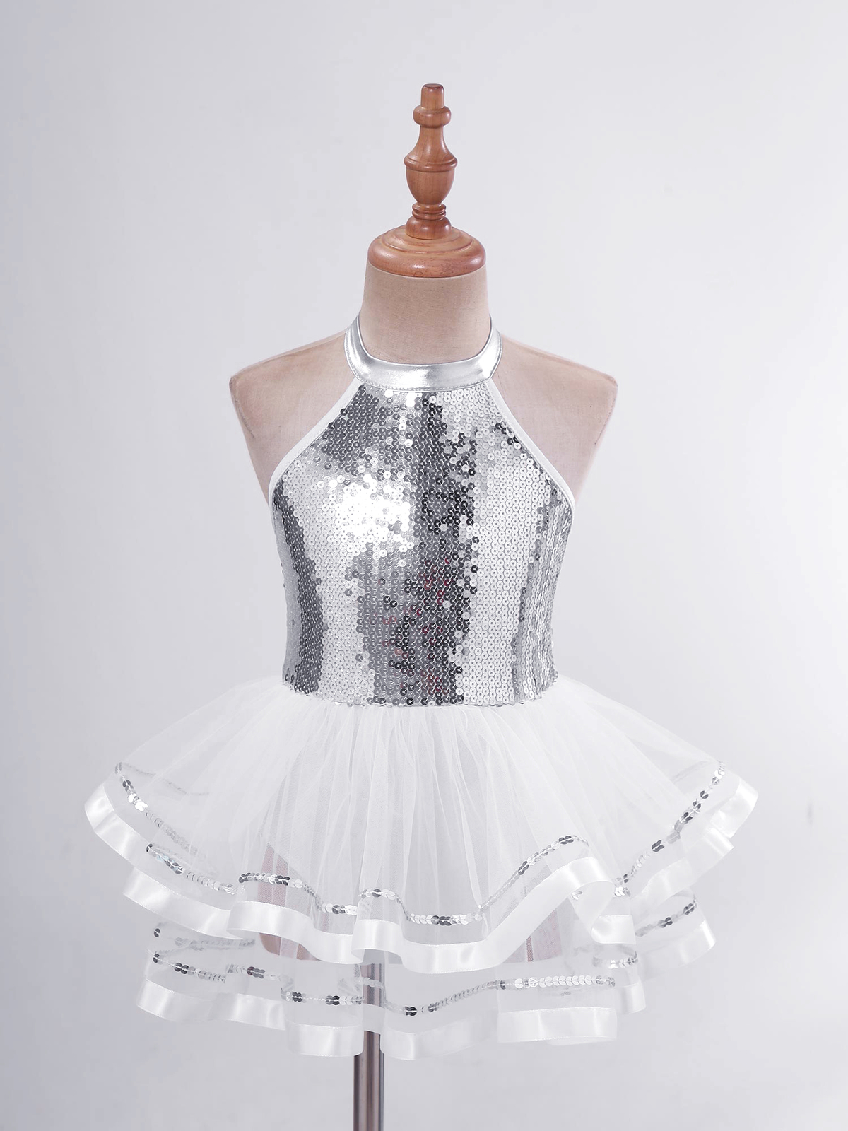 Kids Girls Dancewear Sparkly Leotard Patchwork Dance Dress Ballroom Tutu Dress