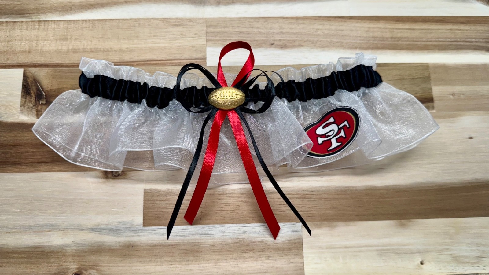 Handmade NFL San Francisco 49ers White Organza Black Satin, Wedding Garters Set.