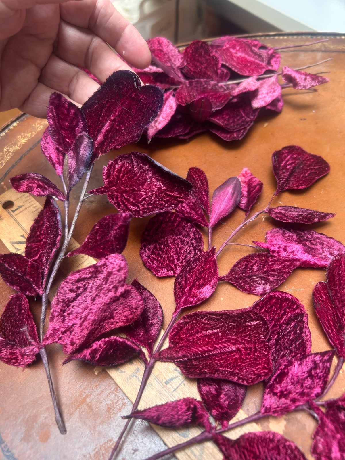 vintage 1940s millinery leaves velvet raspberry 1 spray made in Japan