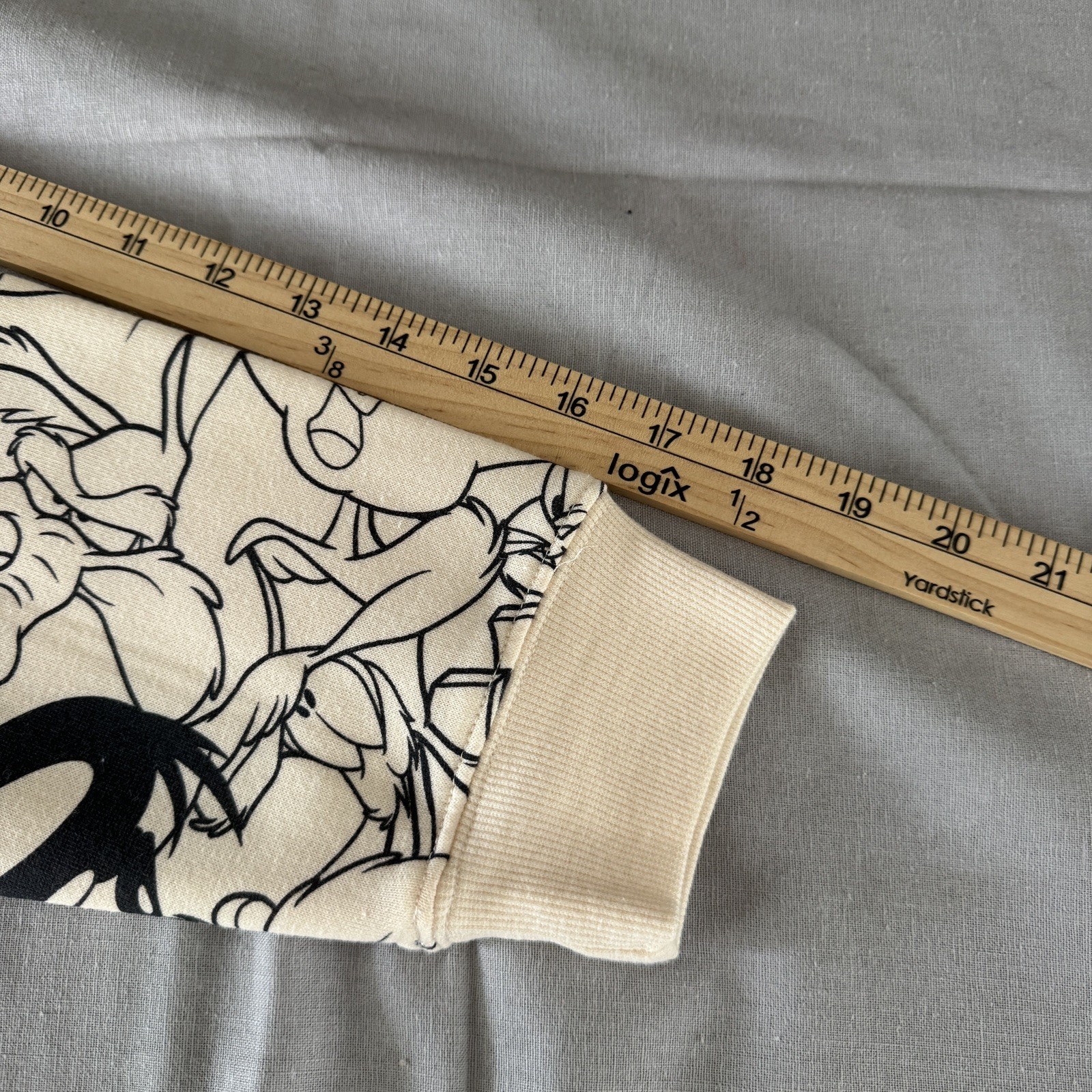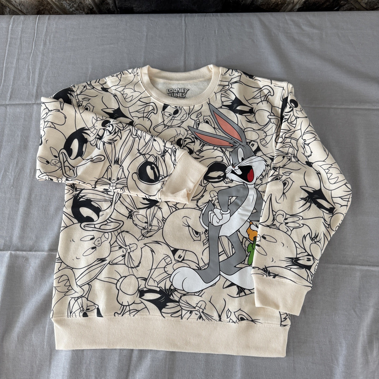 Looney Tunes Youth Sz 11/12 Cream AOP Crewneck Front Back Graphic NWTs Pullover