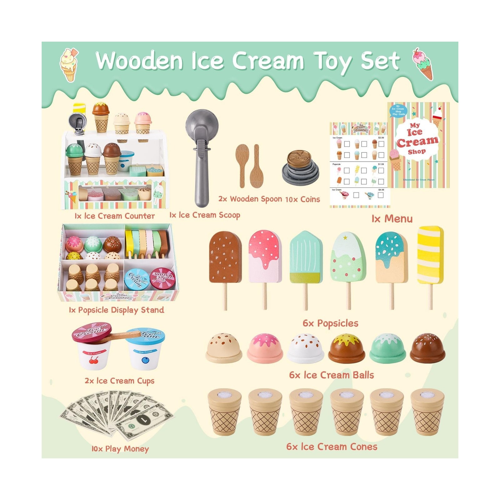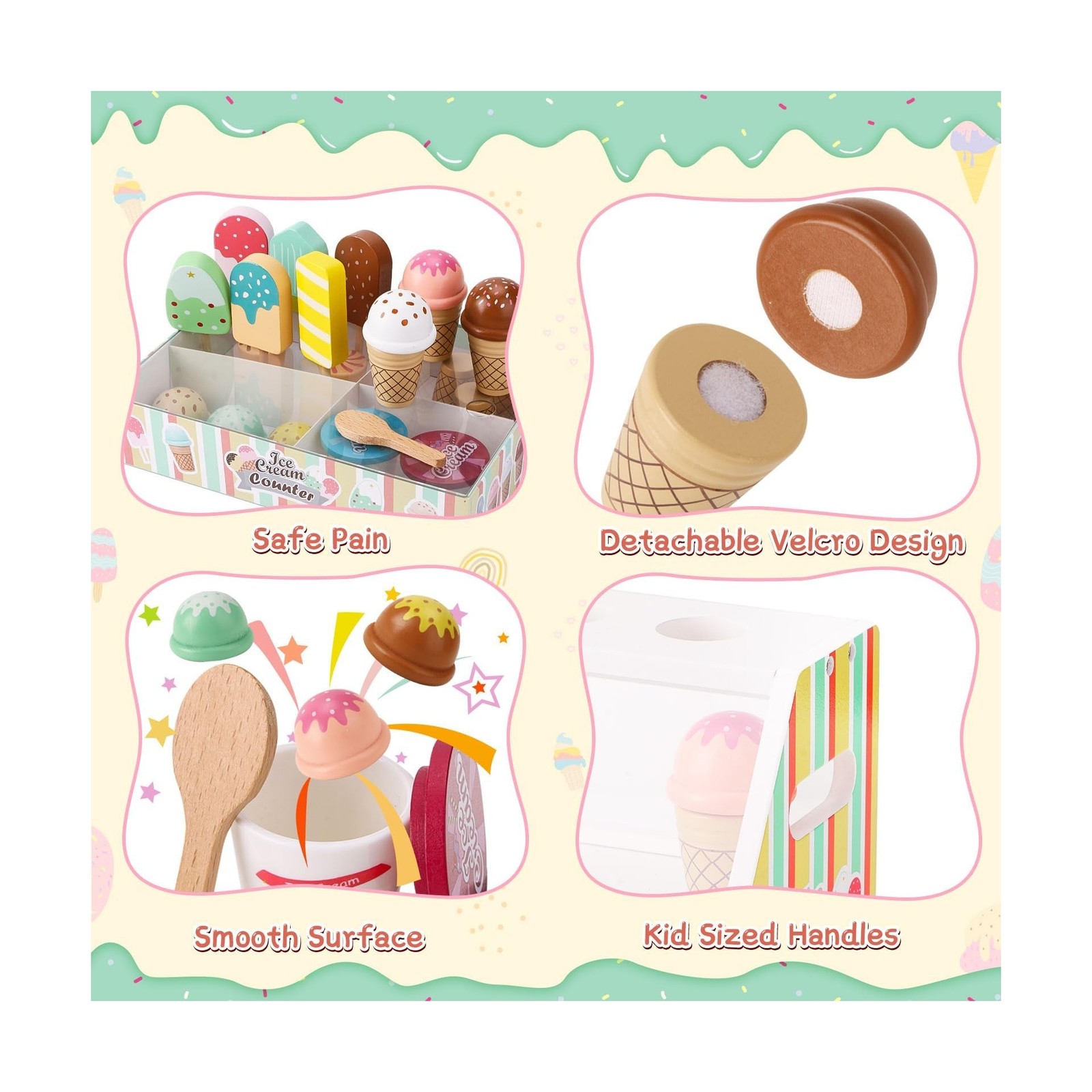 Wooden Ice Cream Toys for Kids Pretend Play Kitchen Food Toys with ... Fast Ship