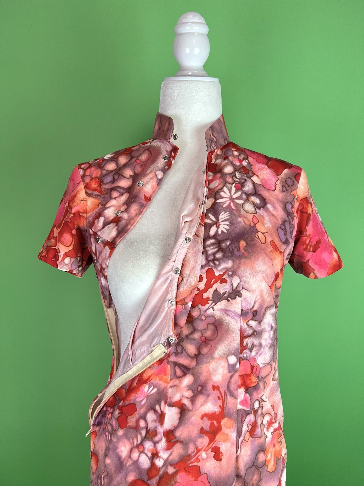 как выглядит Vintage Pink Red Watercolor Floral Cheongsam Dress Pink Floral Qipao - Size XS/S фото