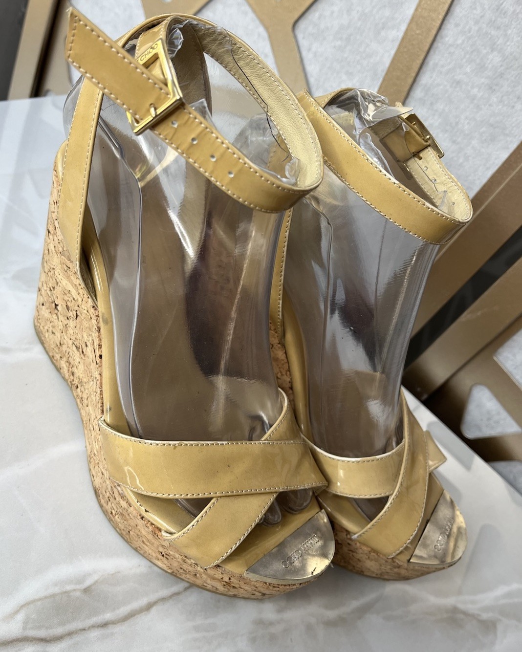 как выглядит Jimmy Choo Platform 1.5  Wedge Cork Heels Tan Leather Sandals Eu 37 Us 6.5 7 фото