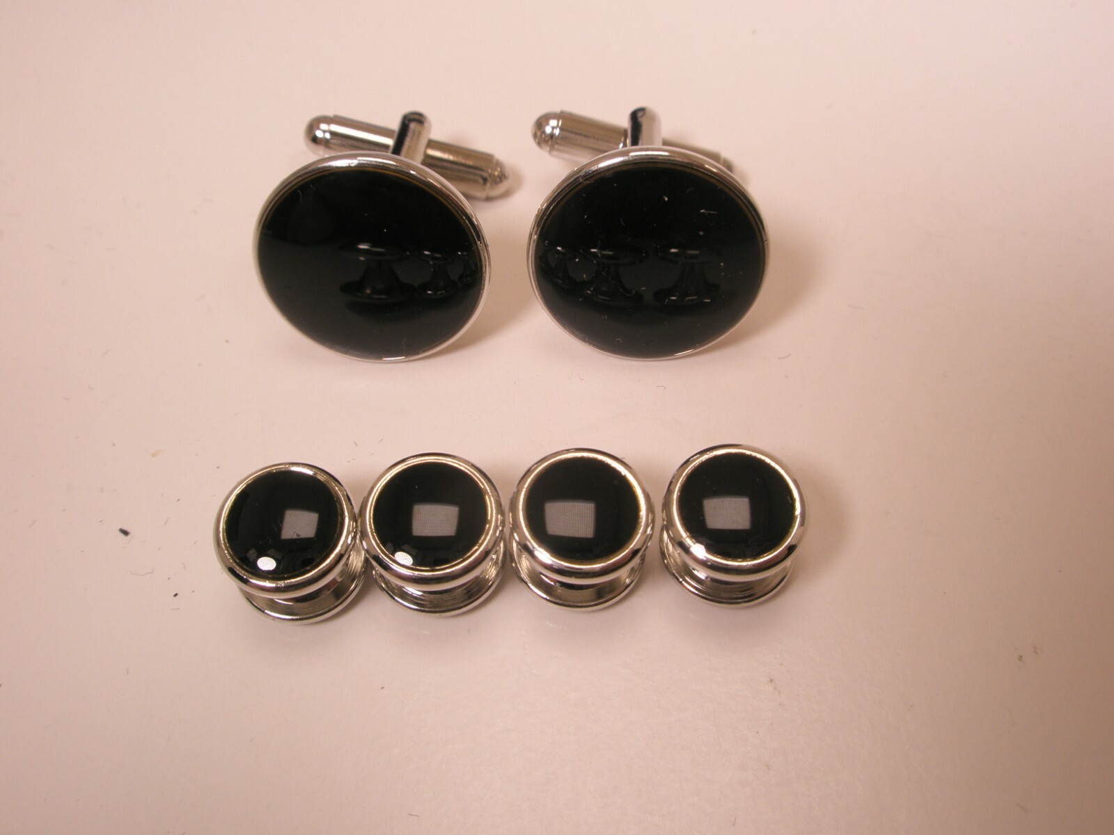 Black Silver Tone Vintage Formal Cuff Links Tux Shirt Studs in box r96
