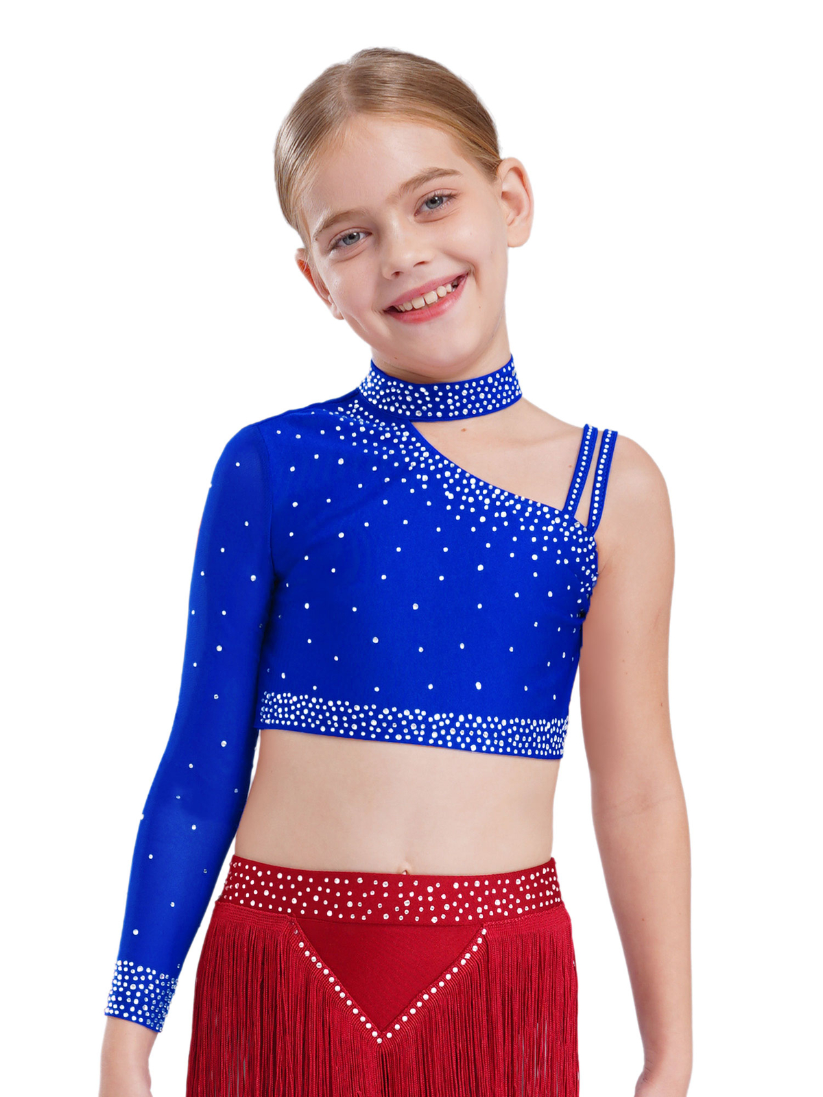 Kids Girls Dancewear Lyrical Outfits Rhinestones Set Carnival One Shoulder Jazz