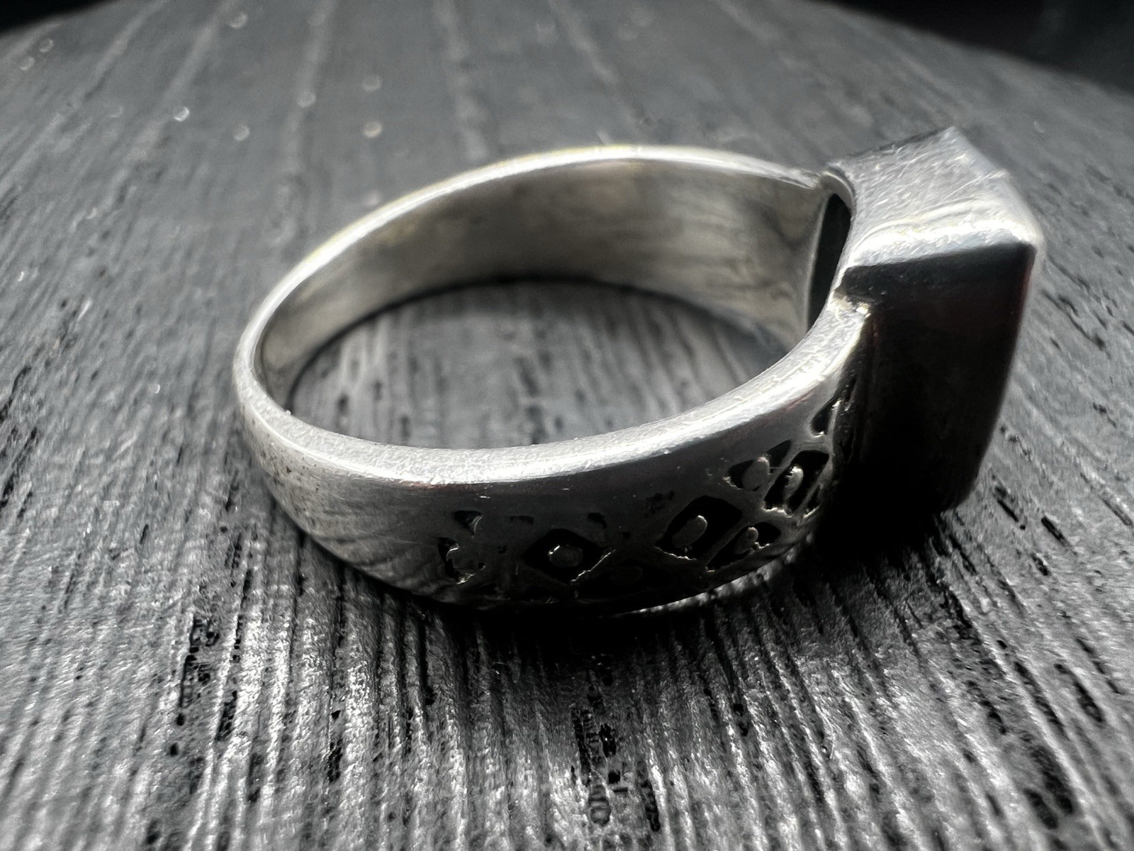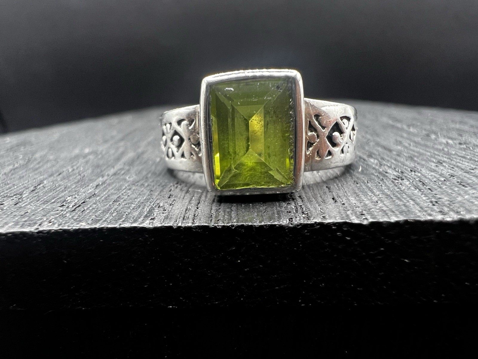 как выглядит Sterling Silver Genuine Peridot Emerald Cut Stone Stamped Pattern Ring Size 6.75 фото