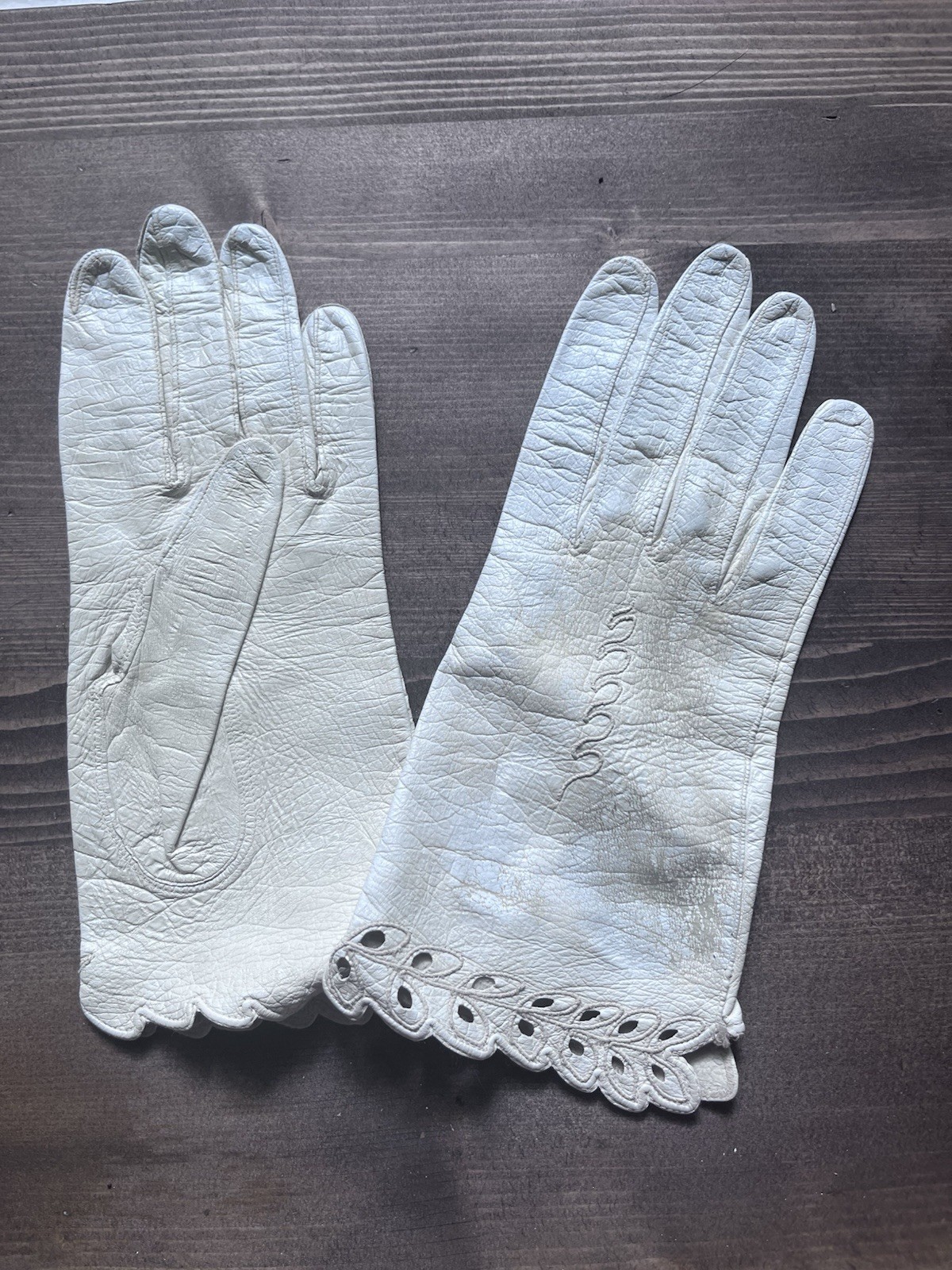 как выглядит Vintage Women s Leather Gloves With Embroidery 1960 s And Cut Out Detail White фото