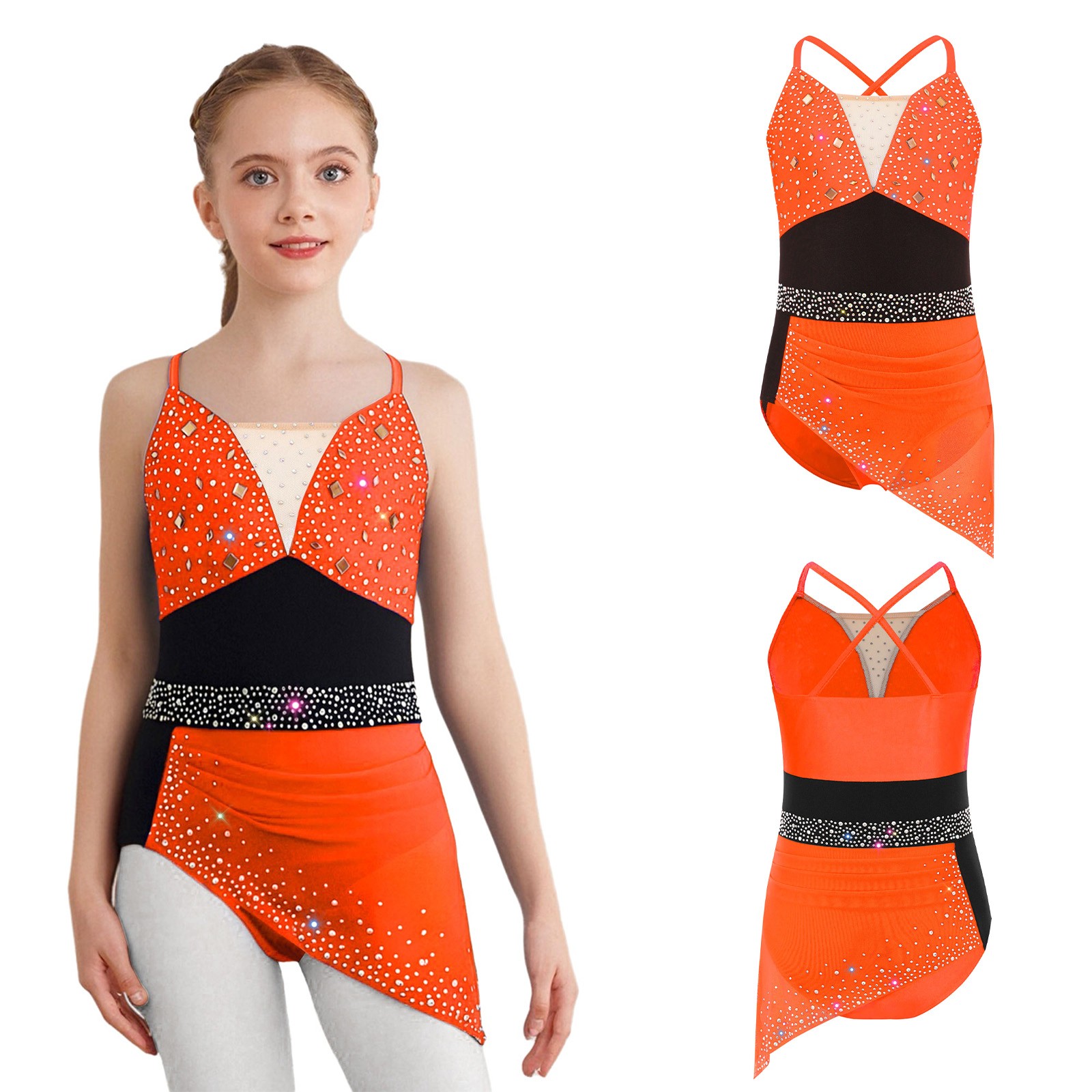 Kids Girls Sparkly Rhinestone Gymnastics Leotard Ballet Figure Ice Skating Dress