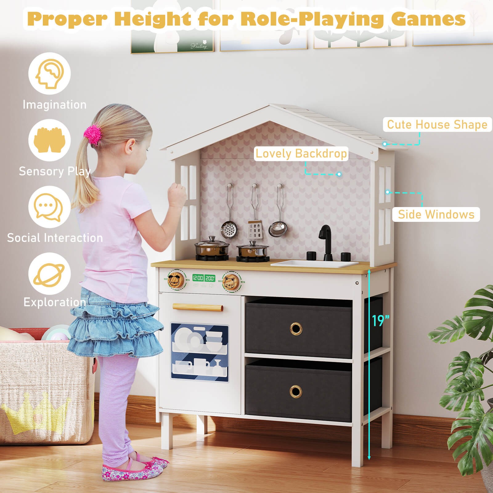 Kids Play Kitchen w/2 Stoves, Rotation Knobs, Faucet, Sink, Dishwasher, Drawers