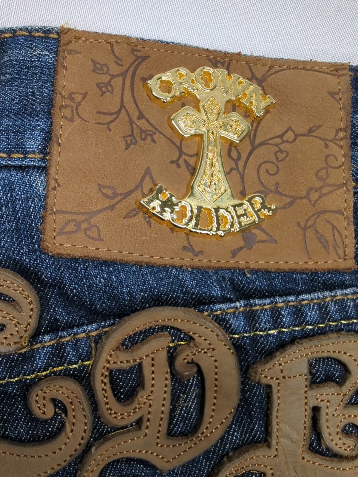 как выглядит Vintage Y2K Embroidered Crown Holder Jeans Pants Mens XL 40 X 34 Tall Gold Cross фото
