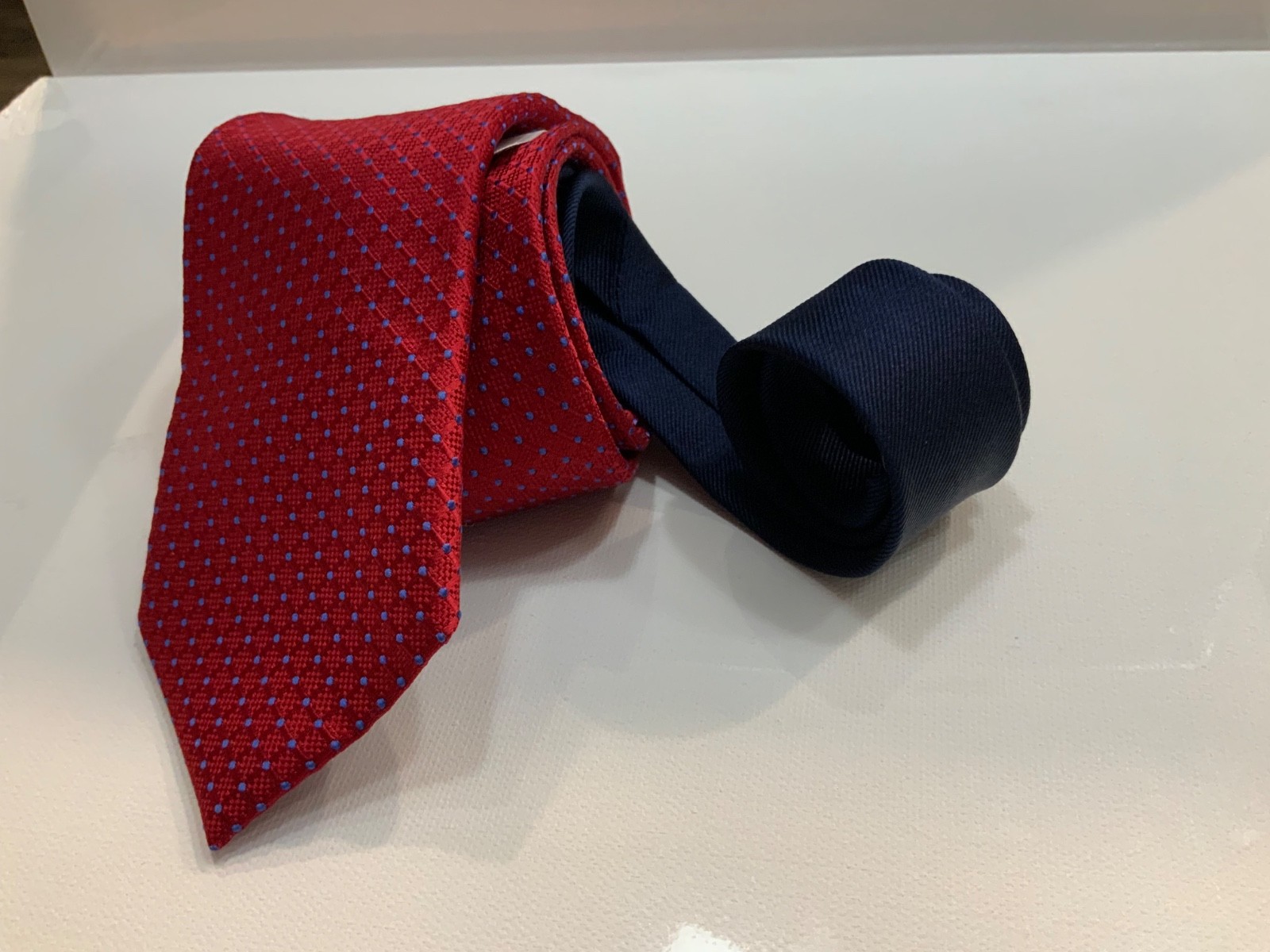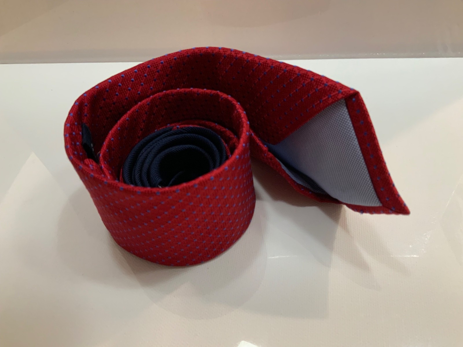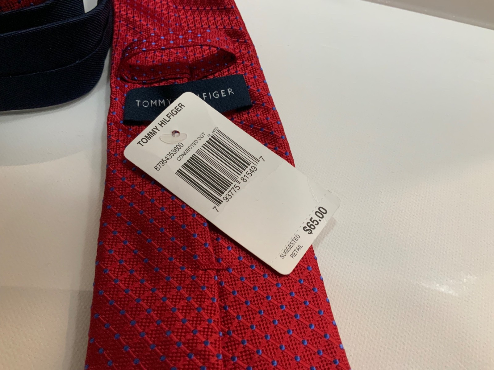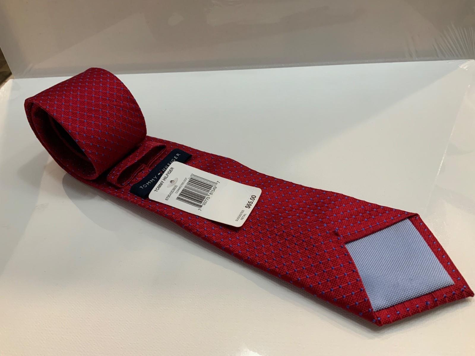 как выглядит Tommy Hilfiger Mens Silk Tie red w/ blue dot geometric 3 x57 msrp 65. NWT фото