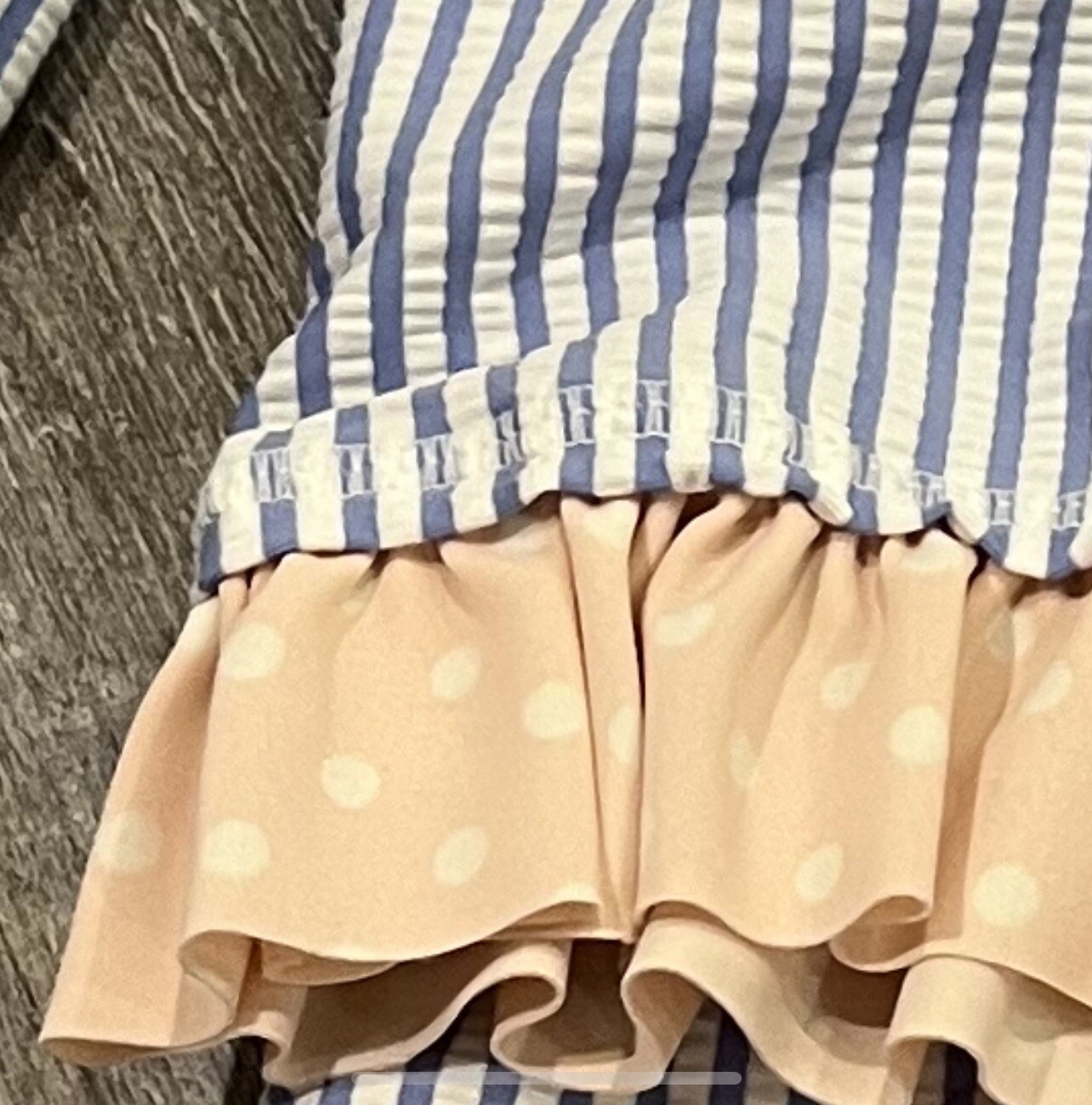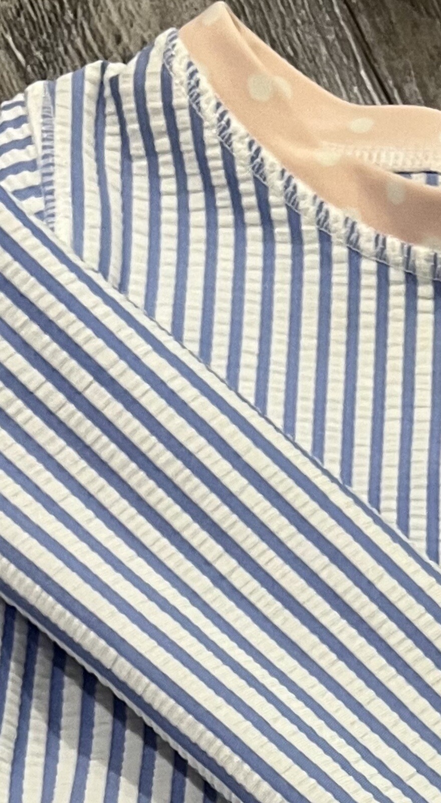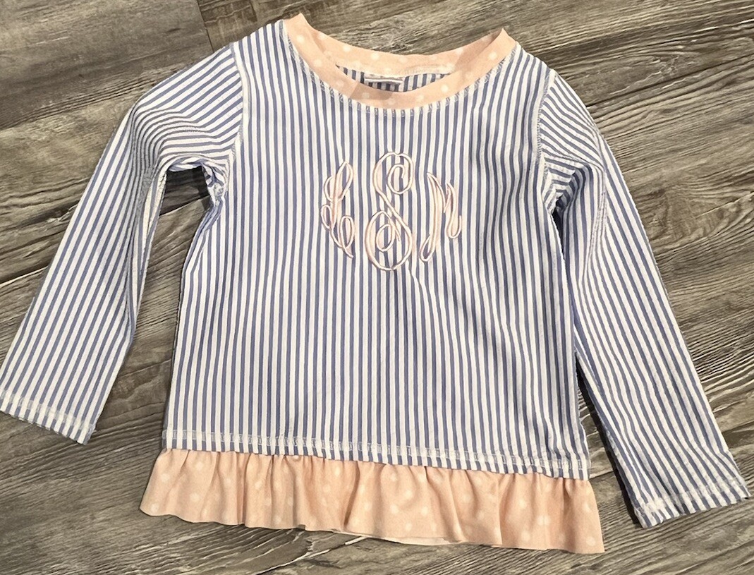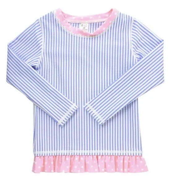 RUFFLE BUTTS Girl s Blue White Strip Seersucker LS Monogram Rash Guard Bikini 2T