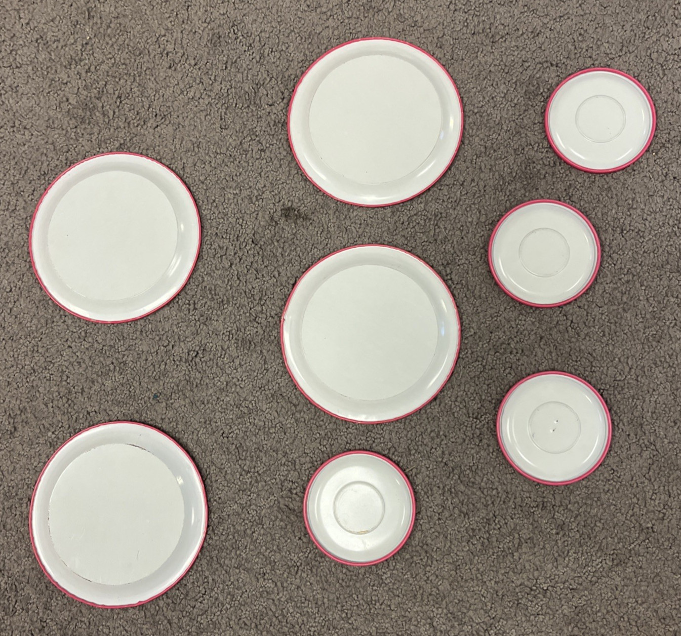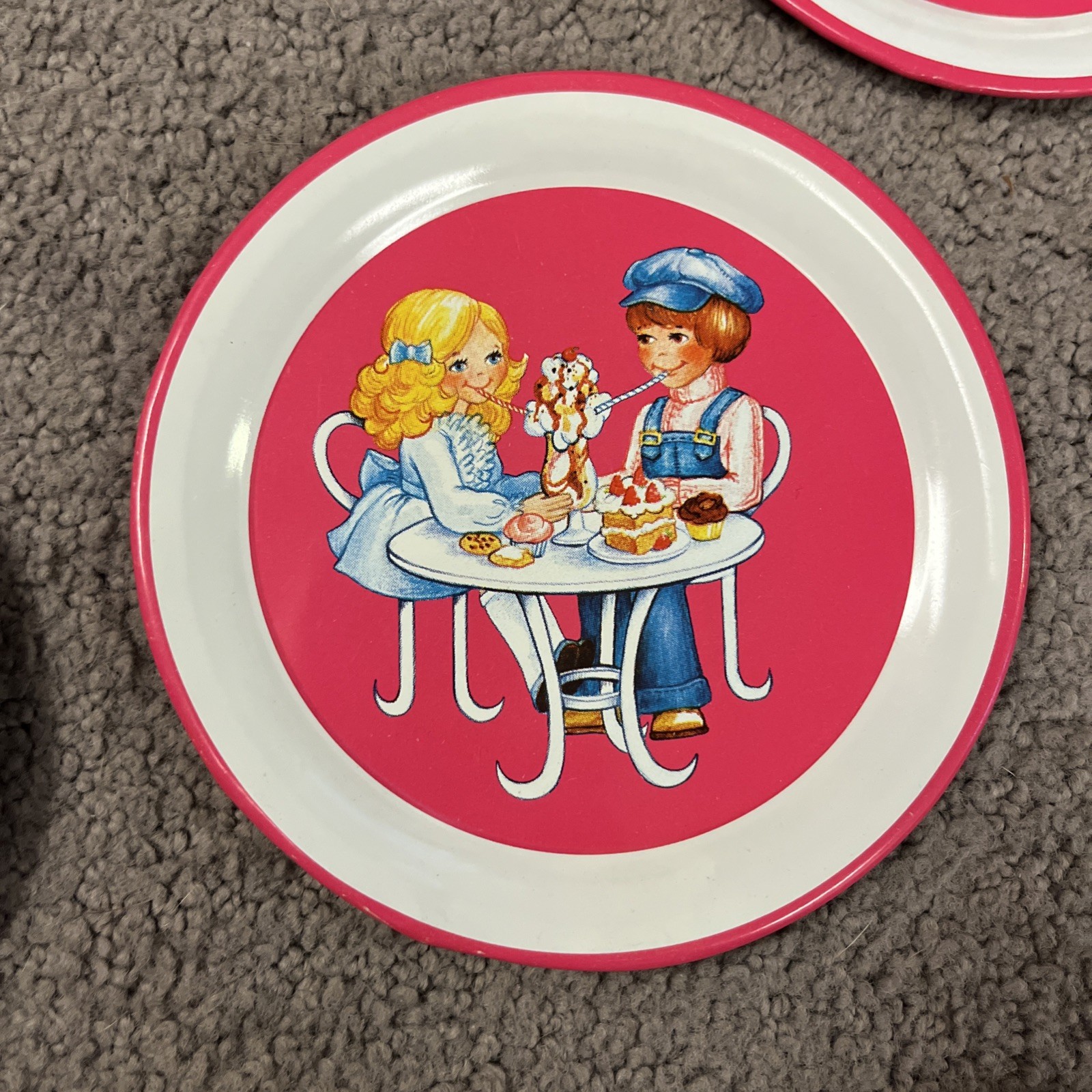 Vtg Tea Set Plates Tin Litho Ohio Art Company Set Of 8 Sundae Couple Pink 70s