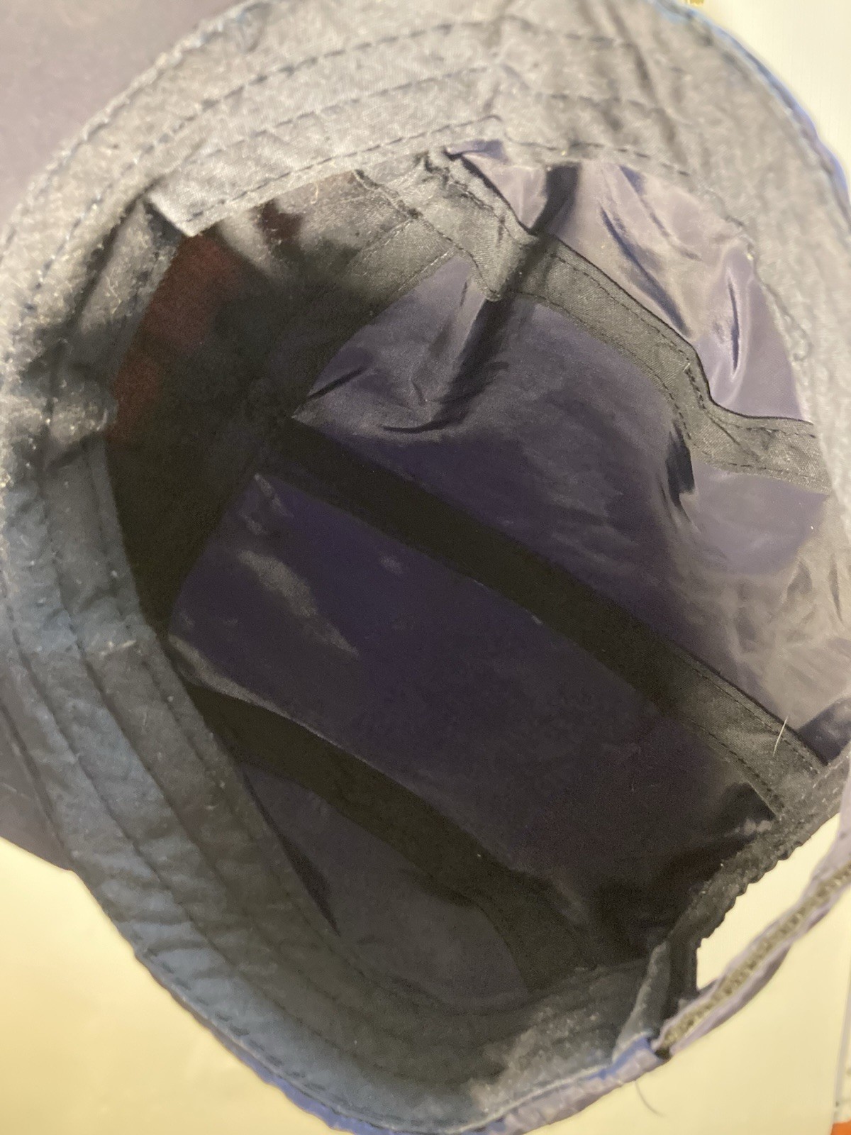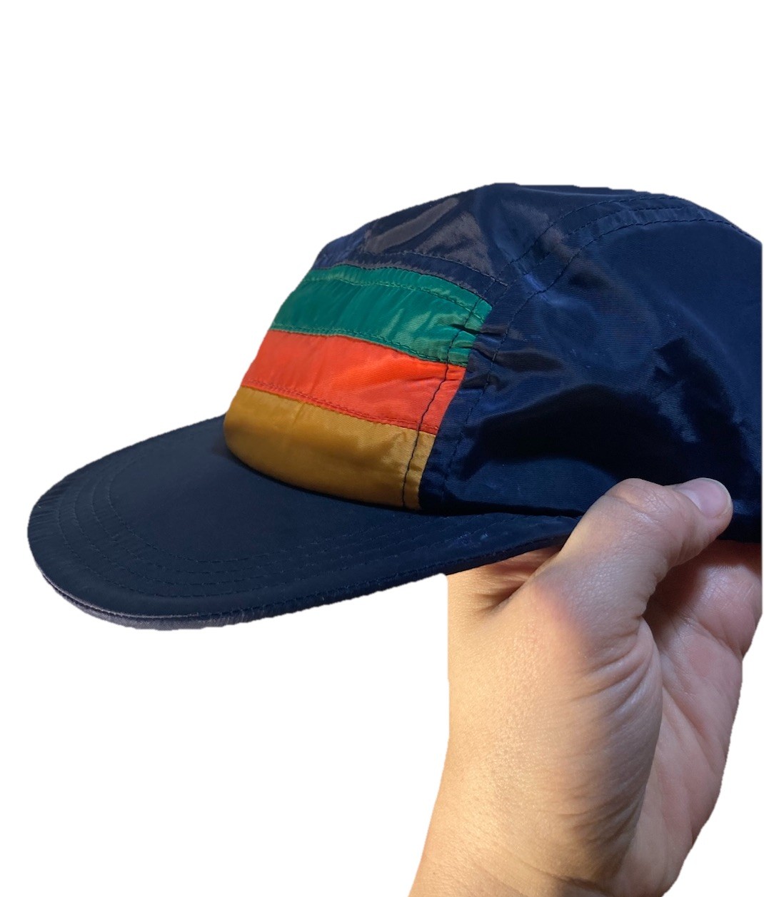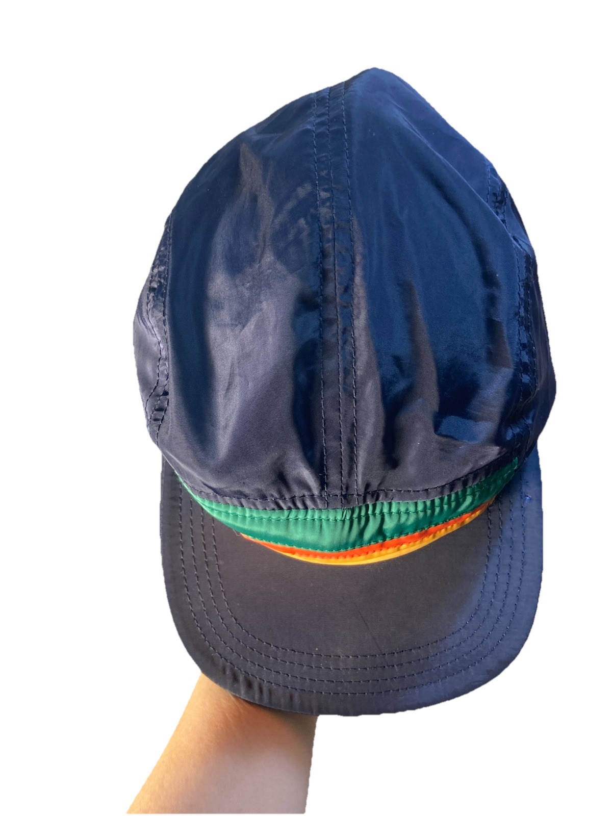 как выглядит Kids Puffer Cap Navy Blue Nylon Hat Orange Stripes No Brand Preowned Retro 80s фото