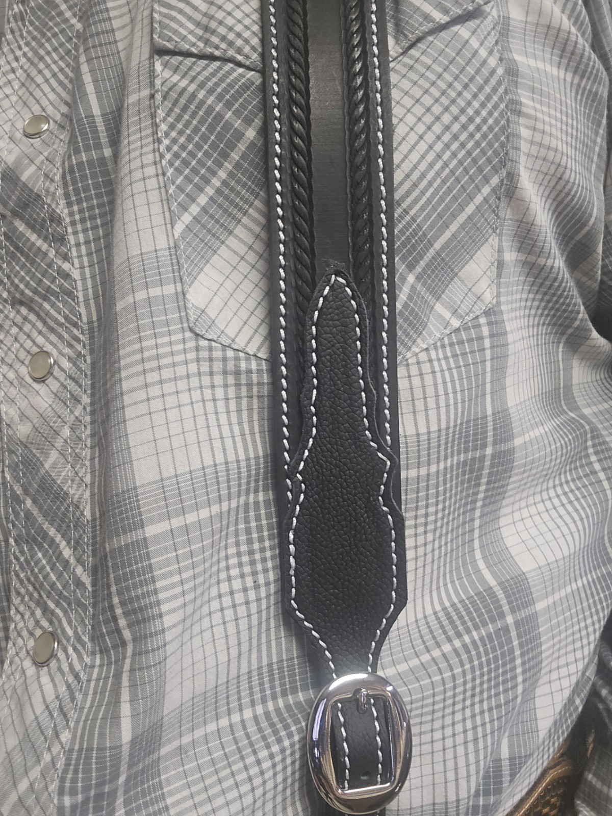 как выглядит black Leather Y-Back cowboy Suspenders with rope stamped border. made in the USA фото
