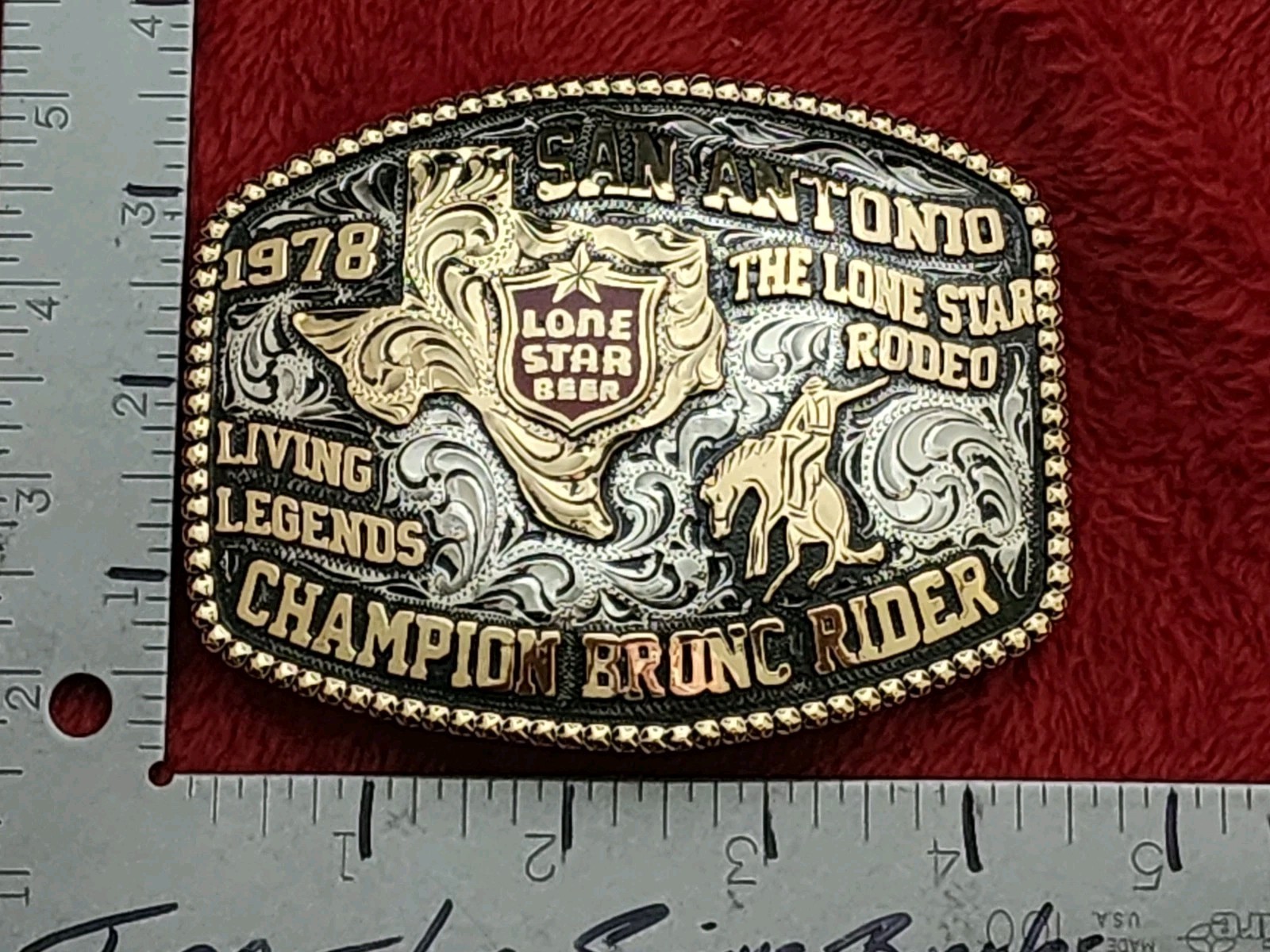 как выглядит Rodeo 1978 Lone Star Bronc Rider Champion Trophy Buckle San Antonio Tex Rare X40 фото