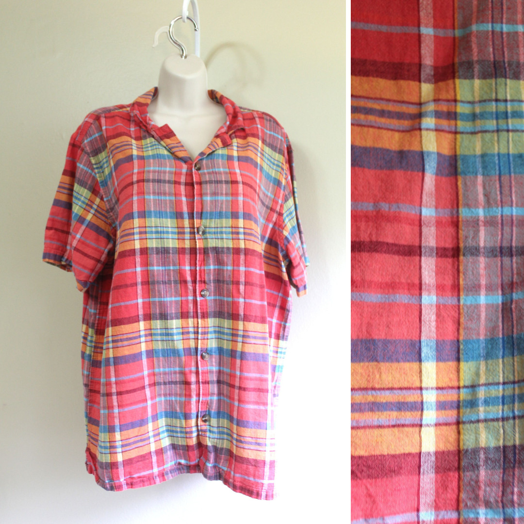 Old Navy Mens L Linen Cotton Shirt Red Blue Yellow Plaid S/Sleeve Button Up