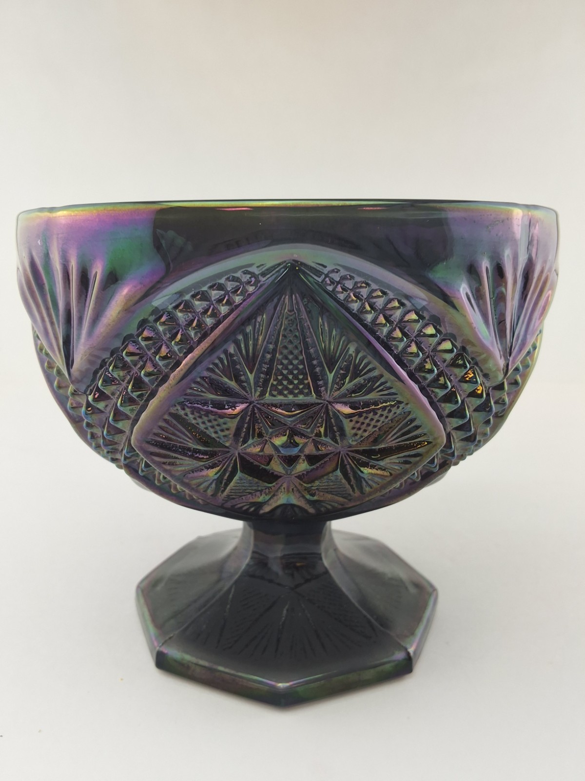 VTG IMPERIAL CARNIVAL GLASS PURPLE AMETHYST EASTERN STAR COMPOTE CANDY DISH