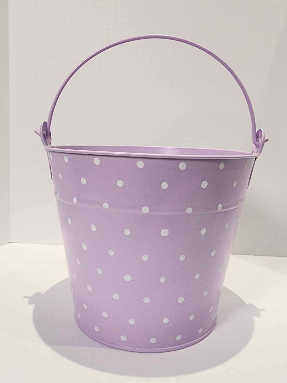 Tin Metal Pail, Color is Pastel Lavender polka dots, Chalkboard front, NEW, RARE
