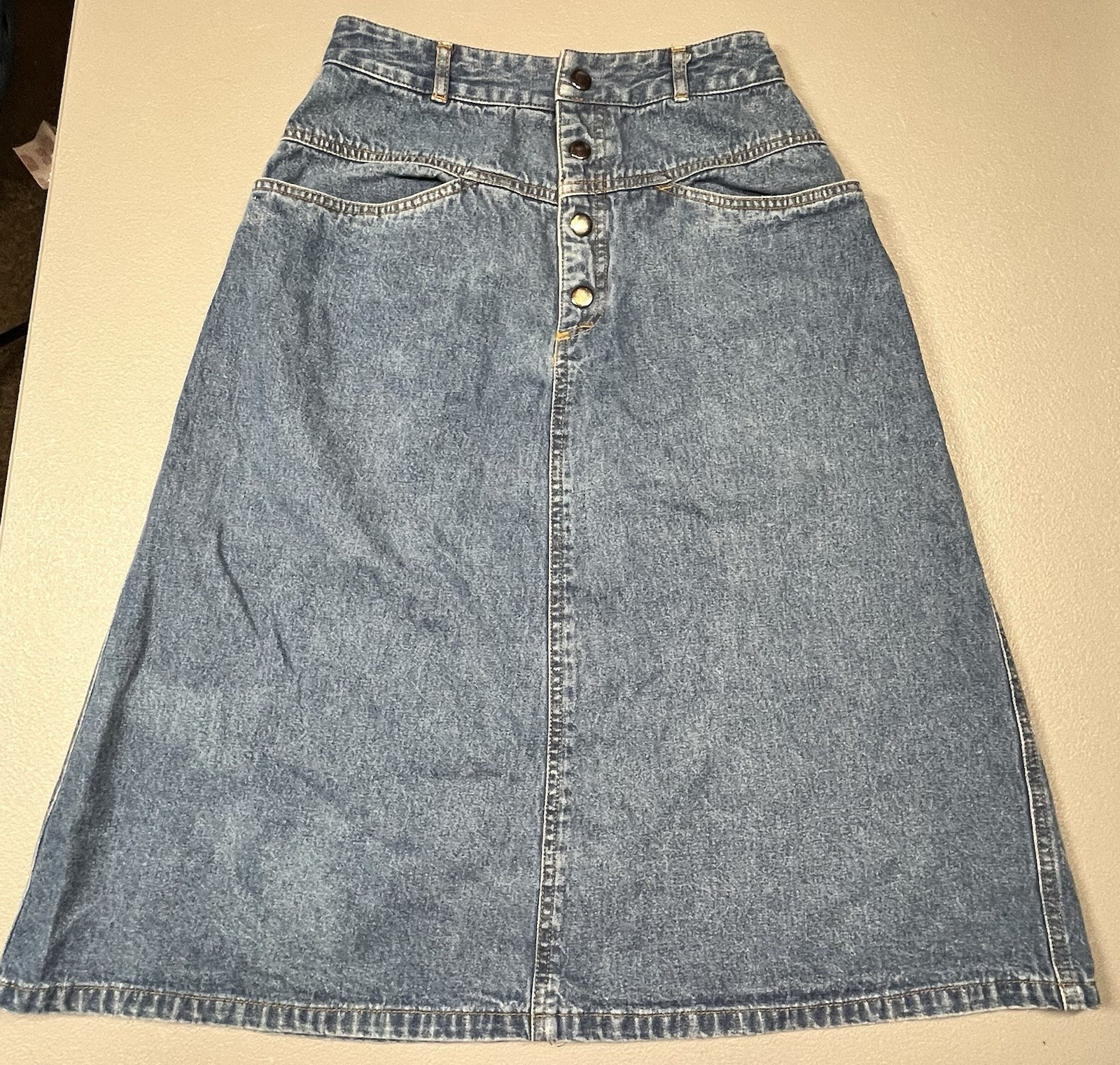 VTG Liz Claiborne Blue Denim Yoked Midi Flare Skirt Pockets Boho Modest Size 4