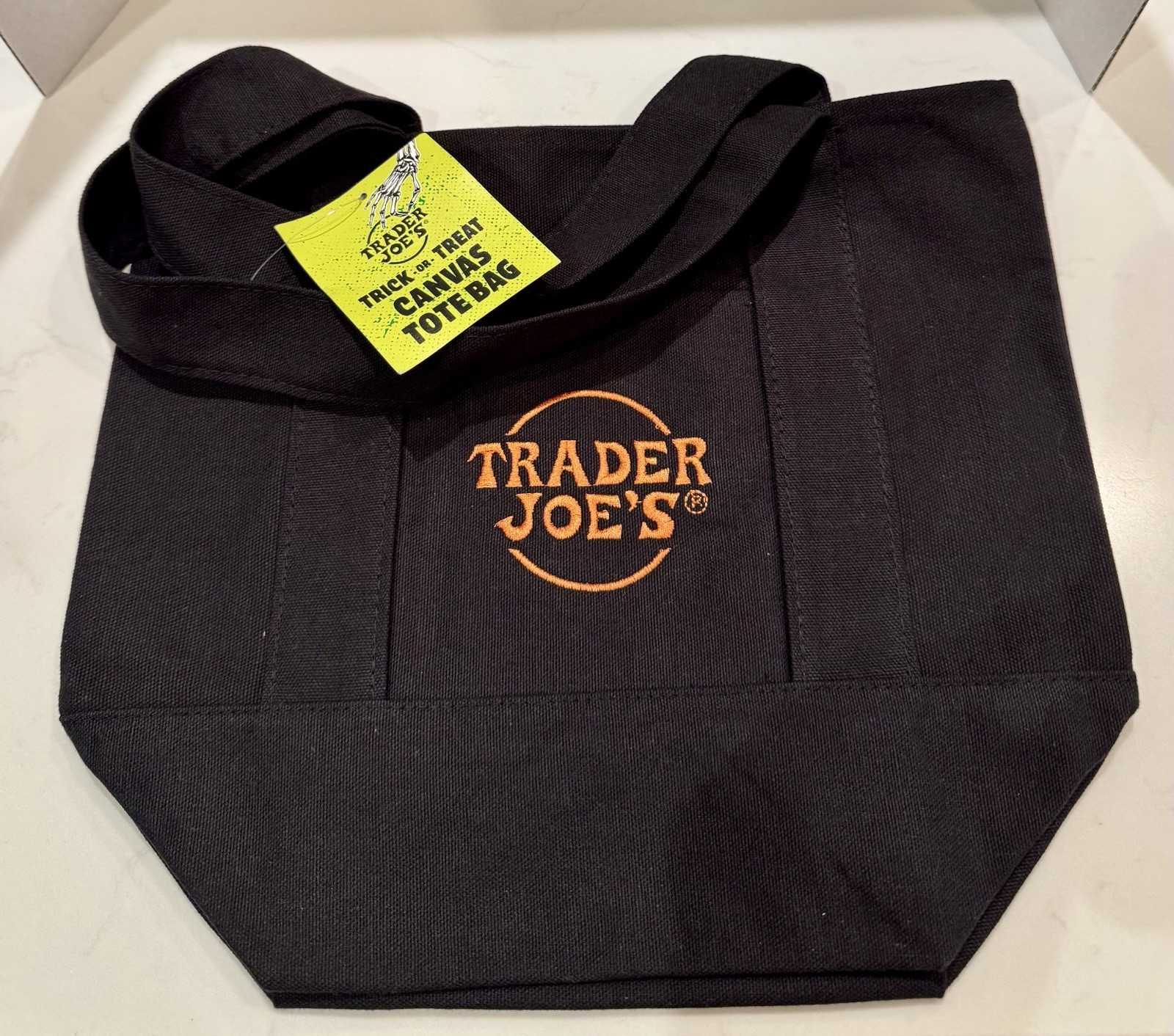 как выглядит Trader Joe s Halloween Mini Canvas Treat Treat Tote Bag Black with Orange Logo фото