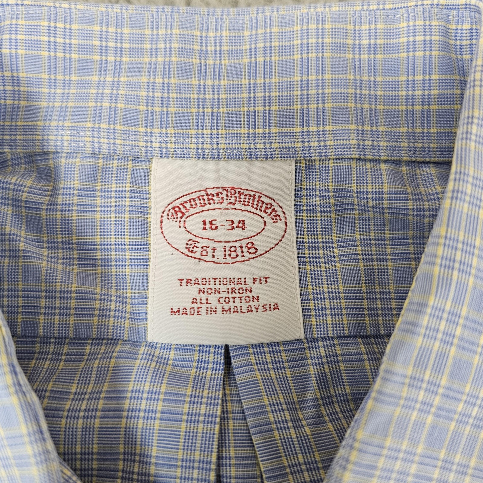 Brooks Brothers Shirt Mens 16-34 Blue Yellow Check Traditional Fit Non Iron