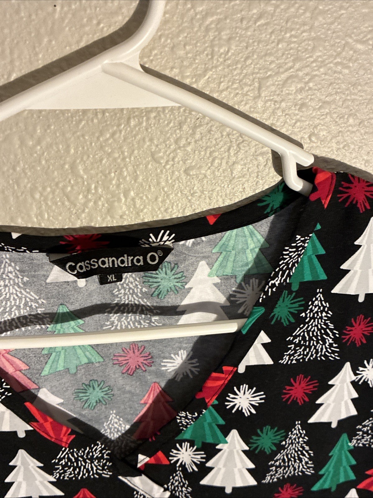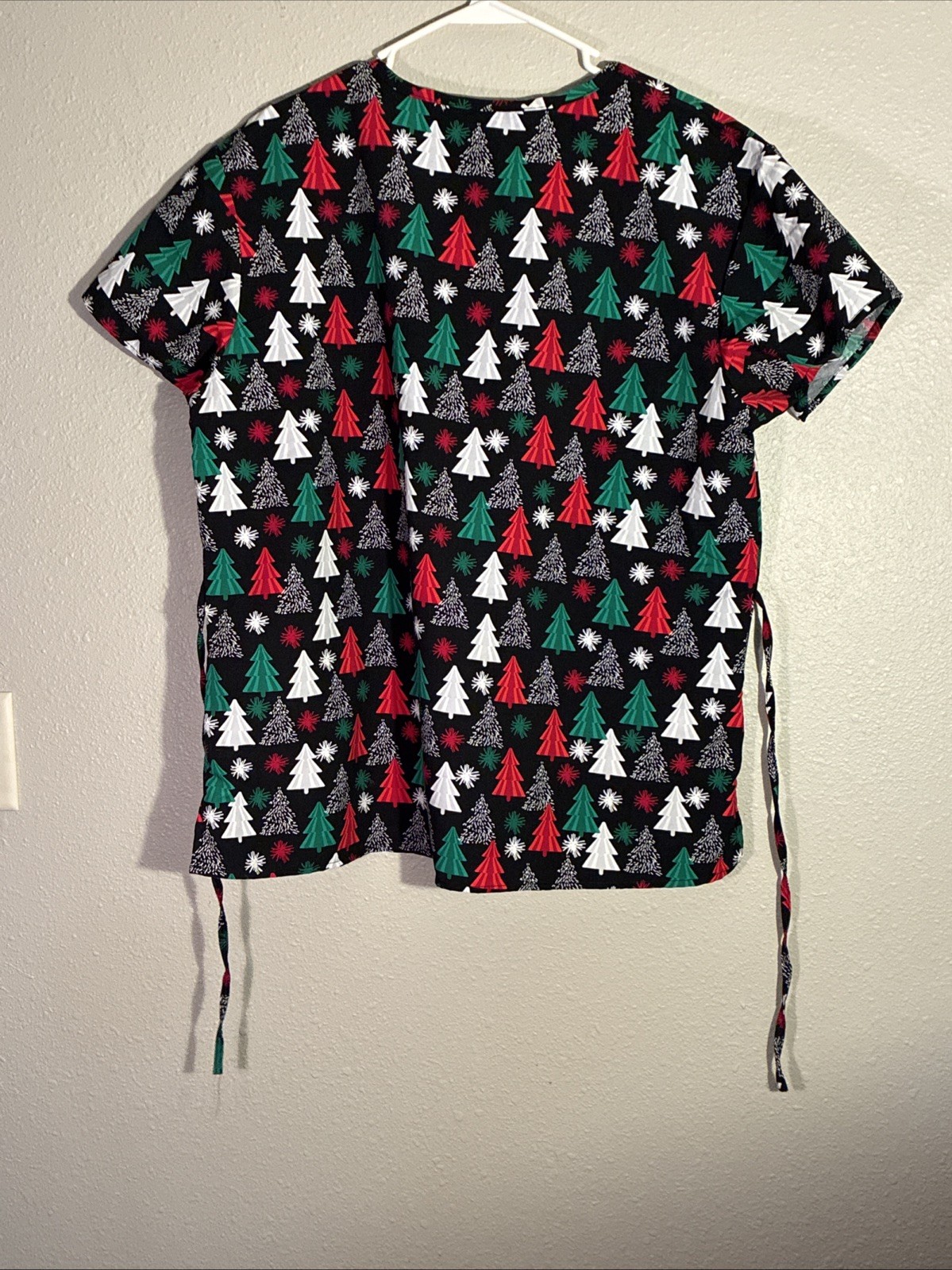 как выглядит New Cassandra O Scrub Top XL Christmas Tree Holiday Black Red Green White фото
